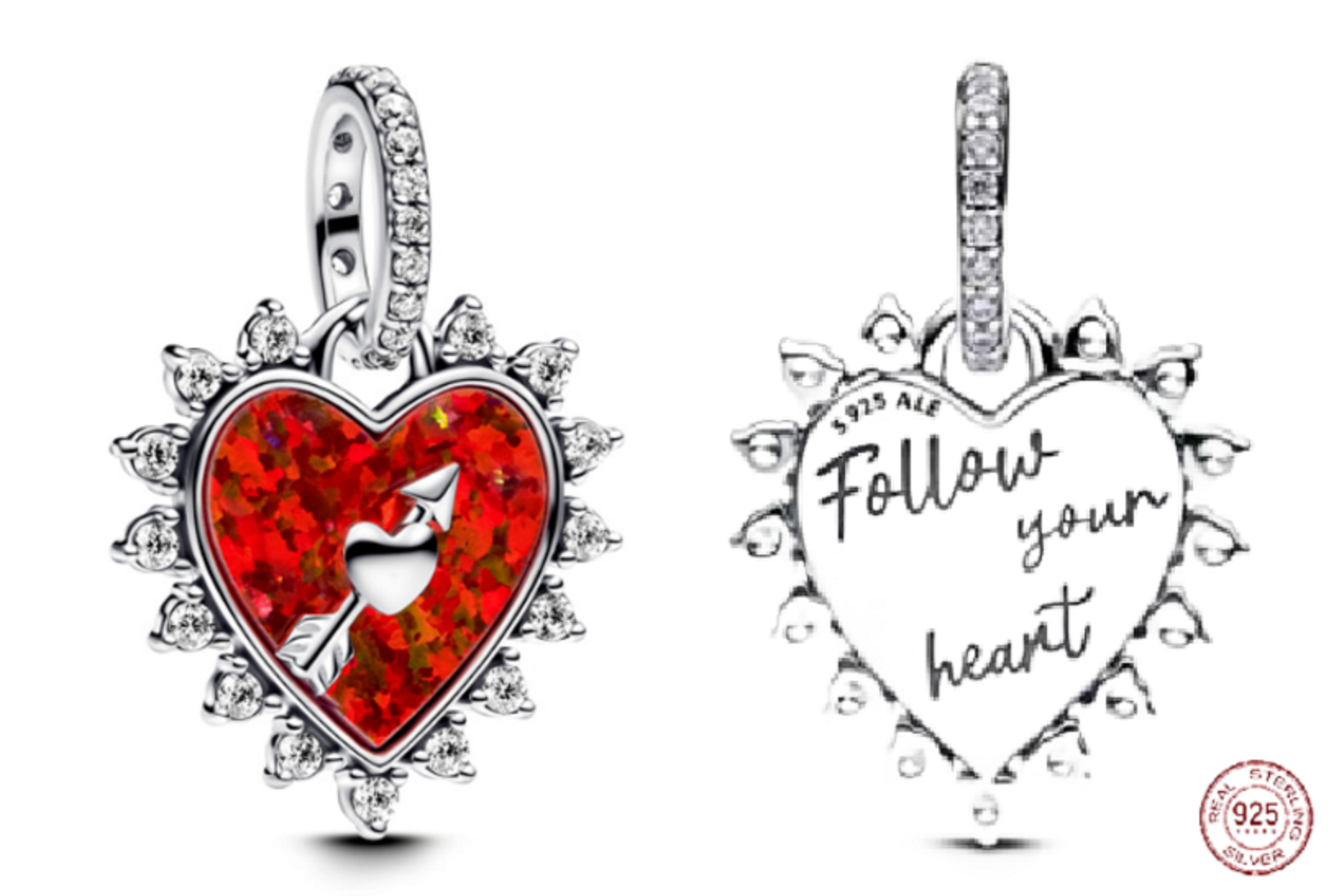 Dodejte svému stylu hravý šmrnc s otočným přívěskem. Je vyroben ze sterlingového stříbra a vyznačuje se červeným opálovým srdcem vytvořeným v laboratoři orámovaným třpytivými čirými kameny kubické zirkonie. Stříbrný šíp se točí dokola a na zadní straně srdce je vyryto „Následuj své srdce“. Kameny vsazené do dlažeb na kauci dodávají tu správnou dávku třpytu. Noste toto kouzlo na náramku nebo náhrdelníku jako připomínku toho, abyste každý den následovali své srdce.