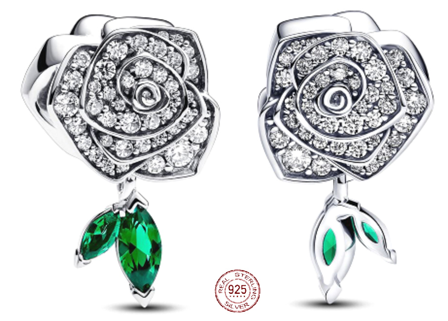 Uzupełnij kwiatową elegancję, symboliczny element wykonany ze srebra próby 925. Skomplikowany projekt, który uchwycił delikatny charakter kwiatu, czar ma efekt warstwowego płatka kwiatu, który odbija piękno kwitnącej róży i jest pokryty błyszczącą rosą. Dwa zielone kamienie wiszą pod kwiatem, reprezentując liście, aby dodać atmosferę realistycznych szczegółów i ruchu. Idealny jako gest miłości do kogoś bliskiego lub jako znaczący dodatek do Twojej kolekcji, ten urok róży z pewnością utrzyma romantyzm przy życiu.
