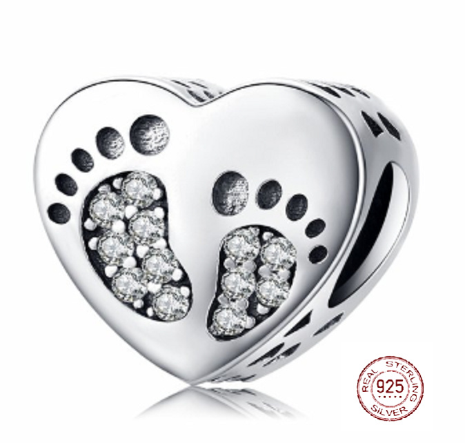 Charm Srebrna 925 Serce odcisk stóp, koralik na bransoletkę rodzina