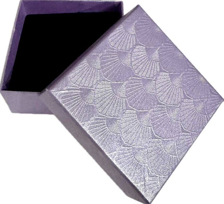 Luxusní dárková krabička na šperky ve fialovém odstínu s originálním texturovaným vzorem vějířů dodává balení noblesní a výjimečný vzhled. Uvnitř se nachází měkká černá houbička, která chrání šperk a zároveň krásně zvýrazní jeho lesk.