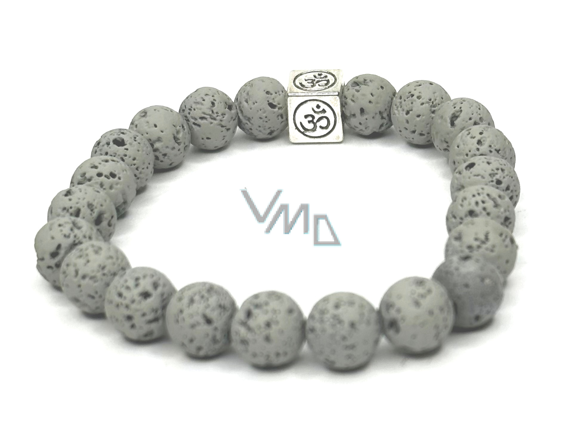 Láva světle šedá s královskou mantrou Óm, náramek elastický přírodní kámen, kulička 8 mm / 16 - 17 cm, zrozen ze čtyř živlů