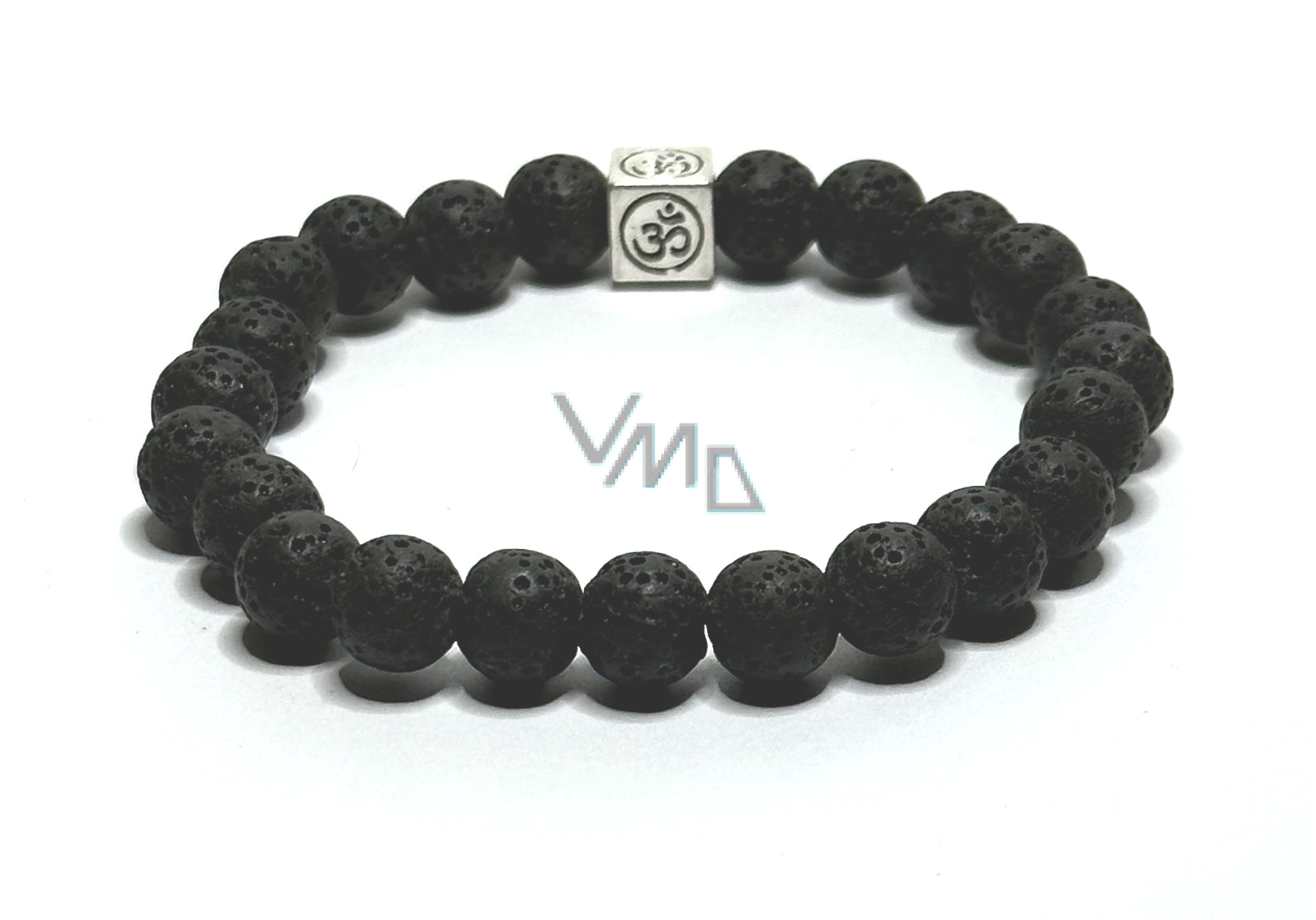 Láva tmavě šedá s královskou mantrou Óm, náramek elastický přírodní kámen, kulička 8 mm / 16 - 17 cm, zrozen ze čtyř živlů