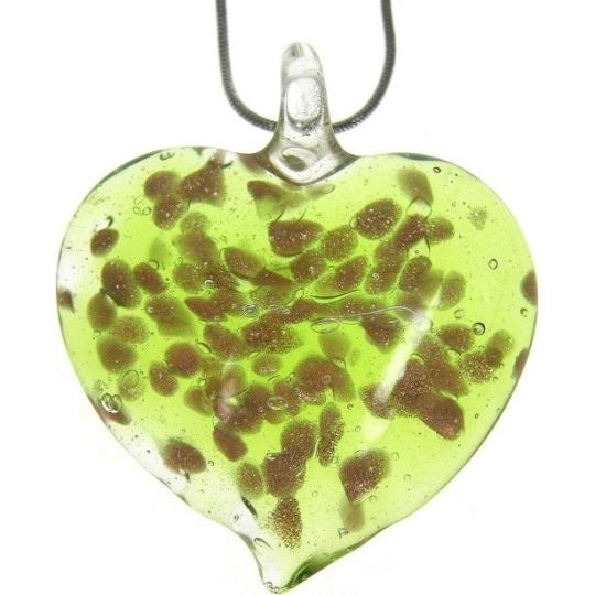 Náhrdelník se skleněným přívěškem ve tvaru srdce. Průhledné srdce má zelenou barvu s broskvově růžovými třpytkami uvnitř. Bižuterní kov má stříbrnou barvu. Zapínání na klasickou karabinku.