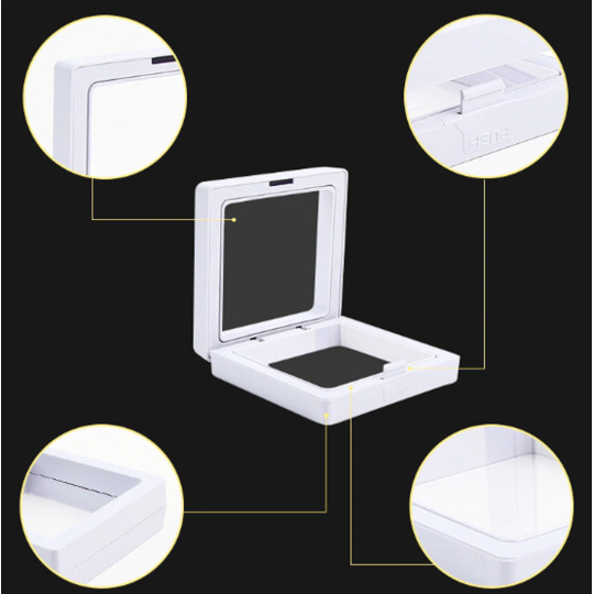 Ramka, do której można włożyć dowolny przedmiot, o ile zmieści się w ramce. Dzięki przezroczystej folii pamięciowej ramkę można używać wielokrotnie. Po zamknięciu ramki folia z obu stron otacza i chwyta wystawiany przedmiot, który następnie sprawia wrażenie, że wisi (pływa) w powietrzu. Możesz wystawić ulubioną figurkę, muszelkę jako pamiątkę z wakacji, włożyć tylko zdjęcie, bilet na koncert, który był najlepszym przeżyciem w życiu i wiele innych rzeczy, które przyjdą Ci do głowy. To super sposób na przechowywanie i wystawianie nawet biżuterii, okularów.