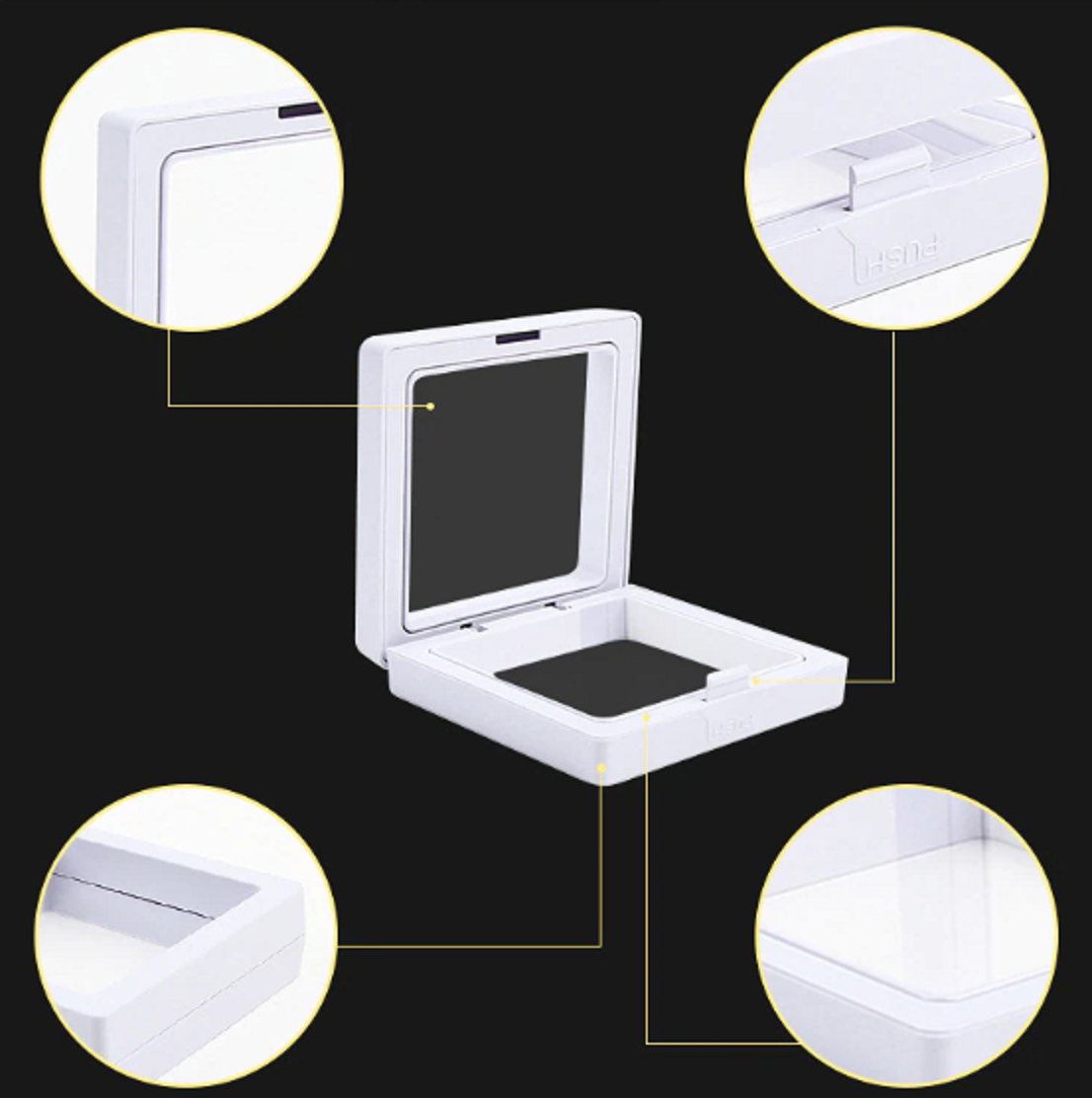 Ramka, do której można włożyć dowolny przedmiot, o ile zmieści się w ramce. Dzięki przezroczystej folii pamięciowej ramkę można używać wielokrotnie. Po zamknięciu ramki folia z obu stron otacza i chwyta wystawiany przedmiot, który następnie sprawia wrażenie, że wisi (pływa) w powietrzu. Możesz wystawić ulubioną figurkę, muszelkę jako pamiątkę z wakacji, włożyć tylko zdjęcie, bilet na koncert, który był najlepszym przeżyciem w życiu i wiele innych rzeczy, które przyjdą Ci do głowy. To super sposób na przechowywanie i wystawianie nawet biżuterii, okularów.