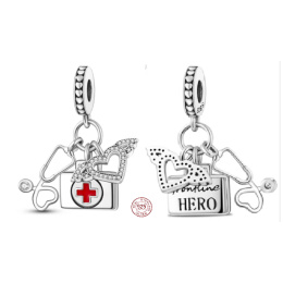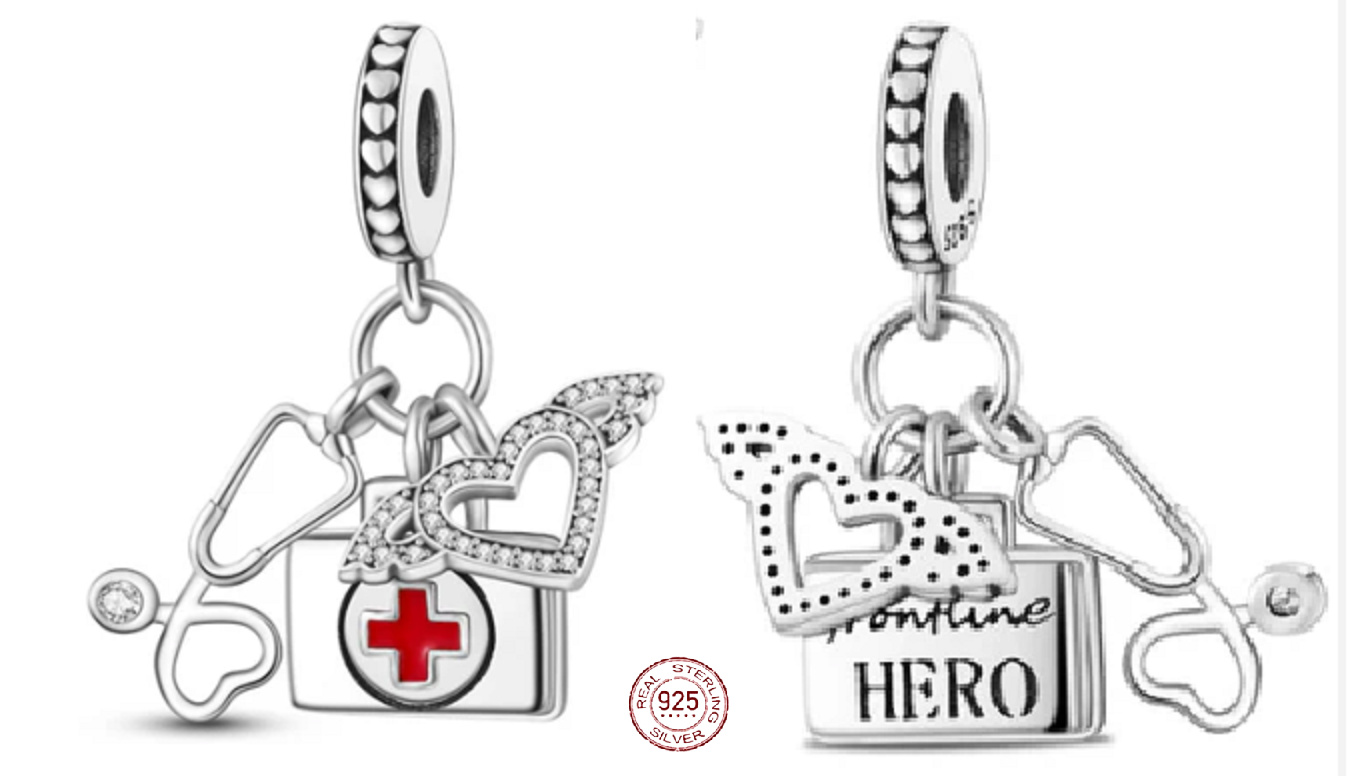 Trojité závěsné kouzlo, kde každý přívěsek symbolizuje péči a zdraví. Na jednom závěsu je jemně zpracovaný stetoskop, na druhém malá lékárnička symbolizující pomoc a bezpečí a na třetím srdce s křídly – což představuje lásku a ochranu. Tento přívěsek má jemný a elegantní design v kovových tónech, jako je například stříbrná. Navržen s hladkým červeným smaltem a bílými třpytivými drahokamy Zirkonu. Na zadní straně přívěsku je vyrytý nápis „Frontline Hero“. Krásná pocta lékařskému světu.