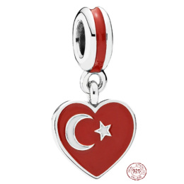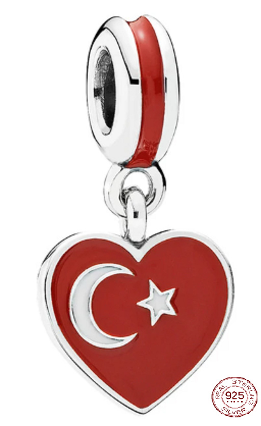 Charm Srebrna 925 Turecka flaga serce - kocham Turcję, zawieszka na bransoletkę podróżniczą