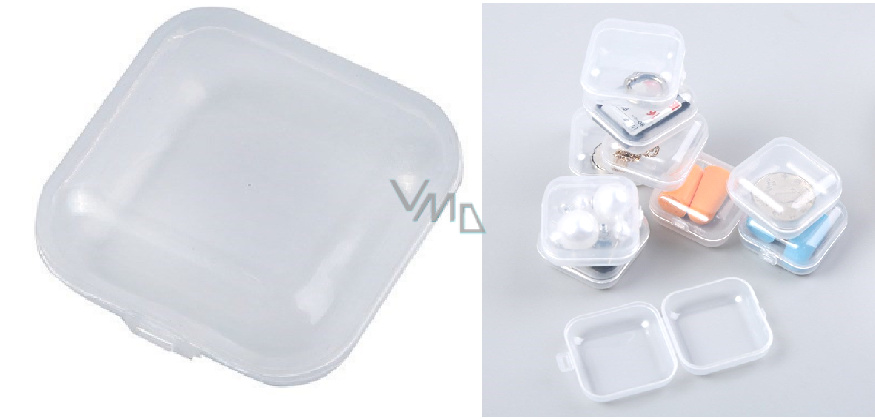 Plastová krabička je vhodná k uskladnění drobných věcí, jako jsou např. náramky, náušnice, řetízky, prstýnky, aj. rozměry: 6,4 x 6,4 x 2 cm barva: čirá