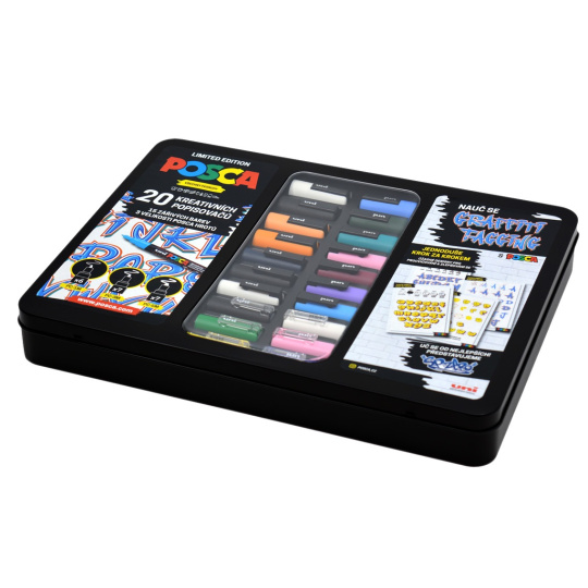 Limitovaná edice Posca Graffiti Tagging obsahuje 20 různobarevných popisovačů ve velikostech 1M, 3M a 5M, exkluzivní vzory od umělce SPZero, barevné návody dvou graffiti stylů a cvičné listy. Vše zabalené v praktické plechové krabičce, která je vhodná i jako dárkové balení.