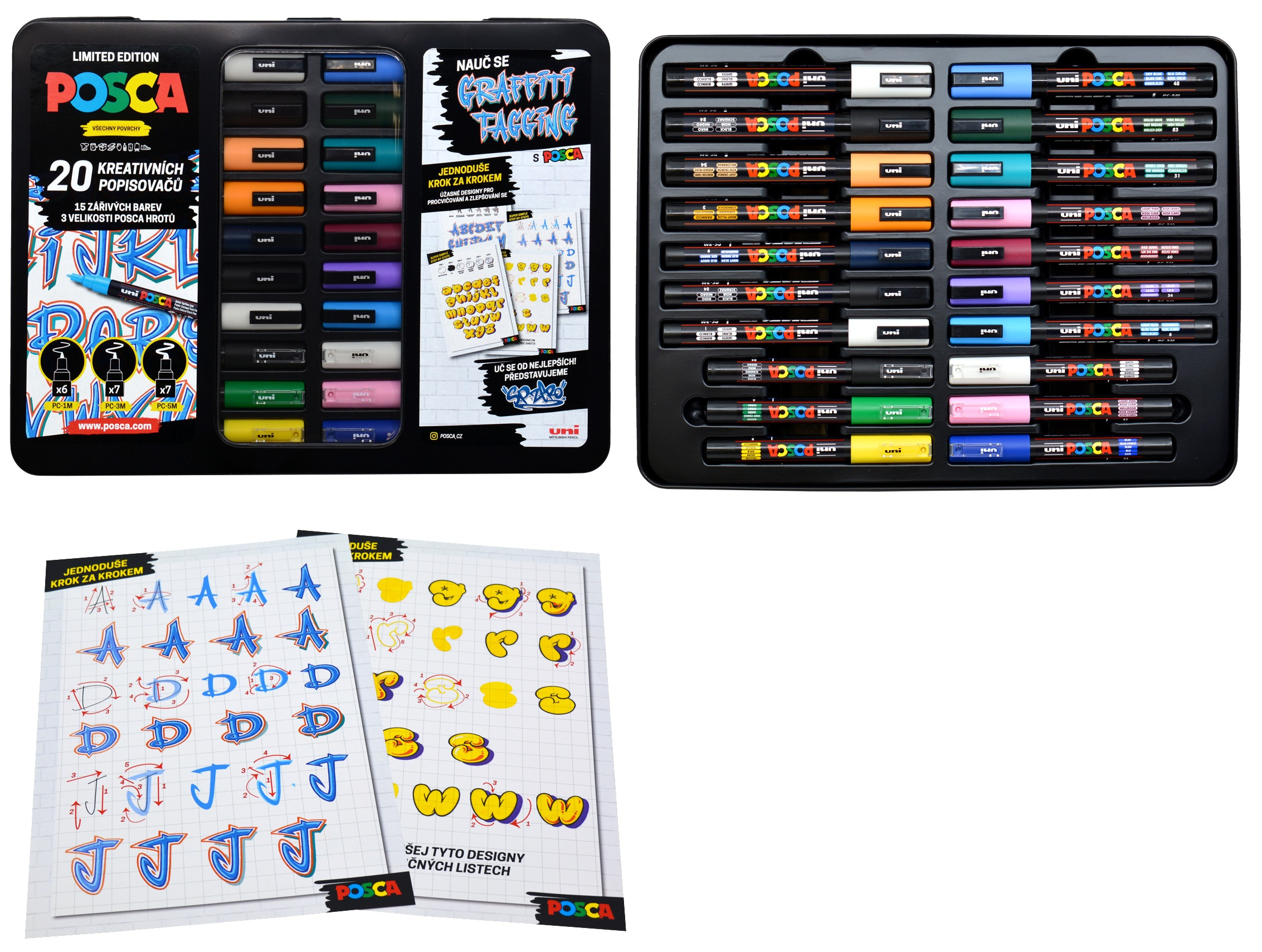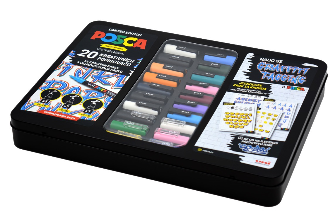 Limitovaná edice Posca Graffiti Tagging obsahuje 20 různobarevných popisovačů ve velikostech 1M, 3M a 5M, exkluzivní vzory od umělce SPZero, barevné návody dvou graffiti stylů a cvičné listy. Vše zabalené v praktické plechové krabičce, která je vhodná i jako dárkové balení.