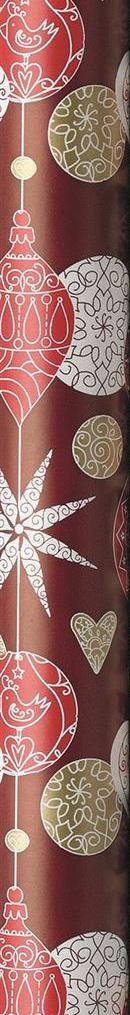 Präsenta Dárkový balicí papír 70 cm x 5 m Vánoční vínový se zavěšenými baňkami, srdci a hvězdičkami