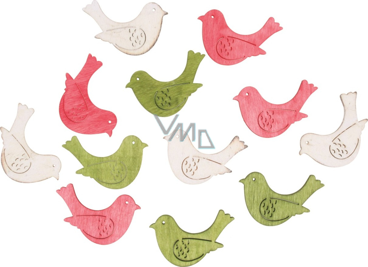 Ptáčci dřevění zeleno-růžovo-bílí 4 cm 12 kusů