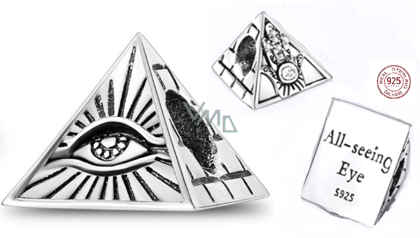 Přívěsek ze stříbra 925 s pyramidou s ochranným okem a rukou, který se nosí pro ochranu a štěstí. Na spodní části přívěsku je vyrytý nápis „All-seeing Eye“, Vševidoucí oko.