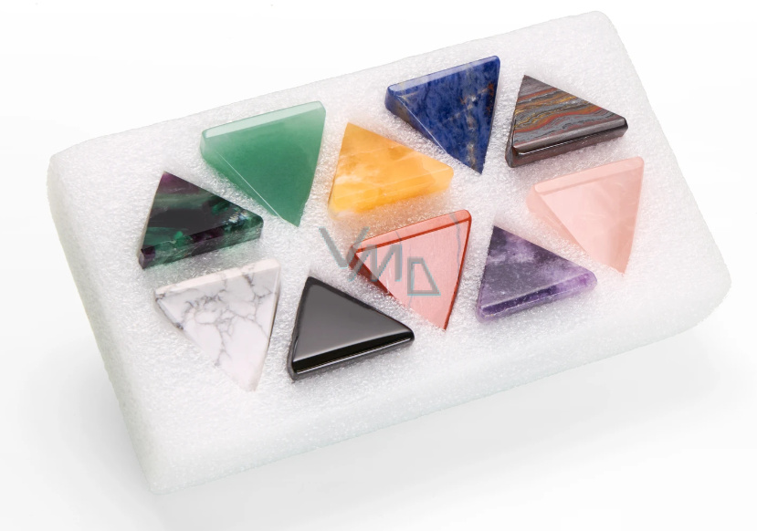 Unikátní dárková sada obsahuje 10 precizně broušených pyramid z přírodních minerálů. Každá pyramida má rozměr přibližně 30 x 35 mm a je zasazena do ochranného bloku z pěnového polyetylenu, obaleného smršťovací fólií