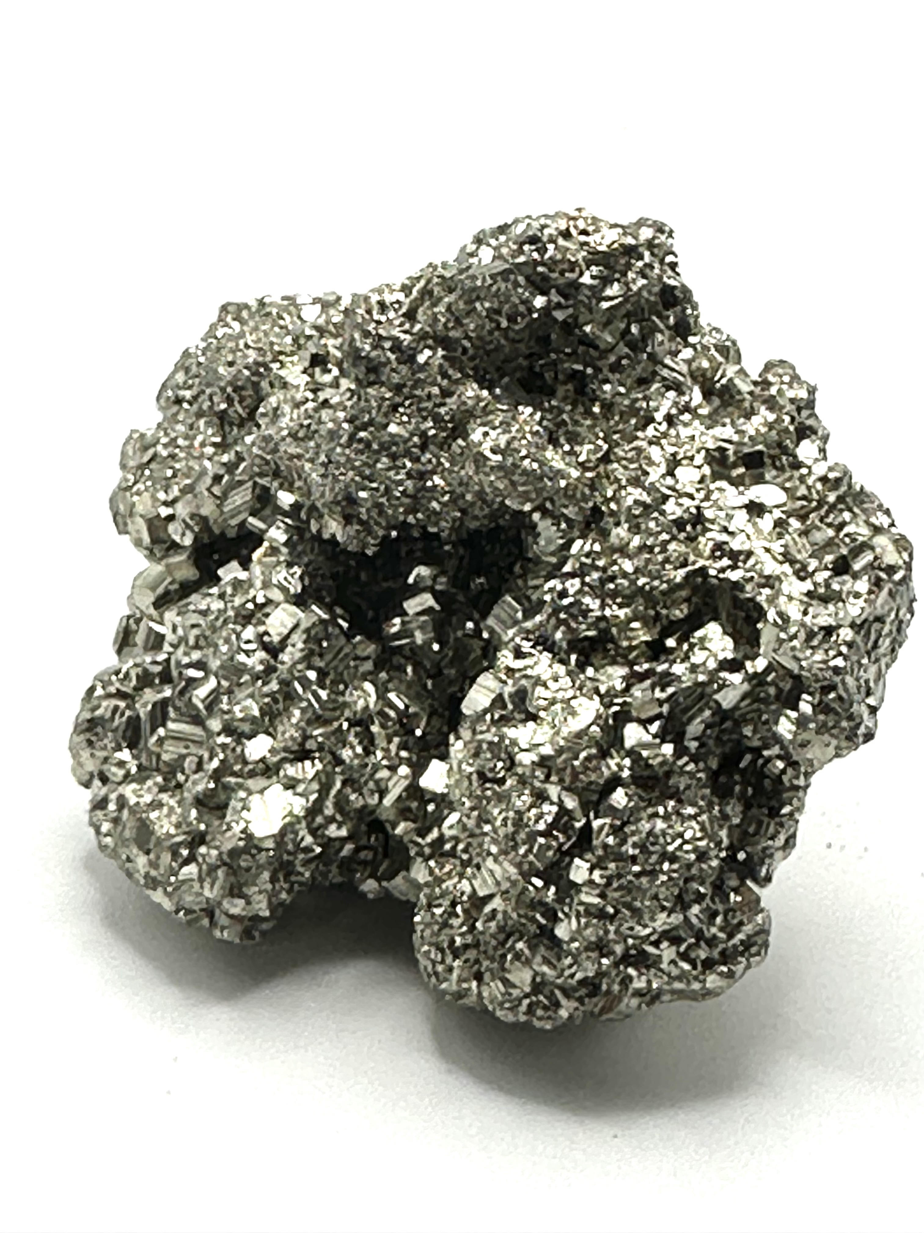 Velmi estetický minerál s pravidelnými krychlovými krystaly, které mohou dorůst až do několika decimetrů. Pyrit je mezi sběrateli oblíbený pro svůj mosazně žlutý nádech a vysoký kovový lesk. Někdy se mu říká "bláznovo zlato" protože byl v minulosti často zaměňován za tento drahý kov. Lokality jeho výskytu se dají nalézt po celém světě, ale ty nejkrásnější jsou se nacházejí v Peru - stejný původ mají i naše kameny. Z hlediska chemického složení se jedná o disulfid Železa.