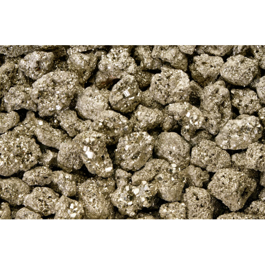 Velmi estetický minerál s pravidelnými krychlovými krystaly, které mohou dorůst až do několika decimetrů. Pyrit je mezi sběrateli oblíbený pro svůj mosazně žlutý nádech a vysoký kovový lesk. Někdy se mu říká "bláznovo zlato" protože byl v minulosti často zaměňován za tento drahý kov. Lokality jeho výskytu se dají nalézt po celém světě, ale ty nejkrásnější jsou se nacházejí v Peru - stejný původ mají i naše kameny. Z hlediska chemického složení se jedná o disulfid Železa.