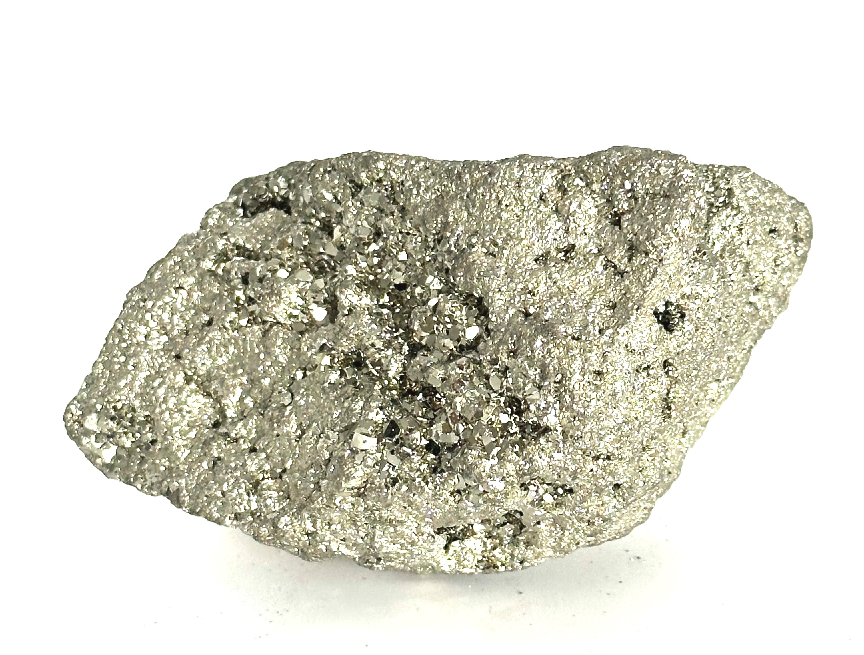 Velmi estetický minerál s pravidelnými krychlovými krystaly, které mohou dorůst až do několika decimetrů. Pyrit je mezi sběrateli oblíbený pro svůj mosazně žlutý nádech a vysoký kovový lesk. Někdy se mu říká "bláznovo zlato" protože byl v minulosti často zaměňován za tento drahý kov. Lokality jeho výskytu se dají nalézt po celém světě, ale ty nejkrásnější jsou se nacházejí v Peru - stejný původ mají i naše kameny. Z hlediska chemického složení se jedná o disulfid Železa.