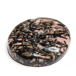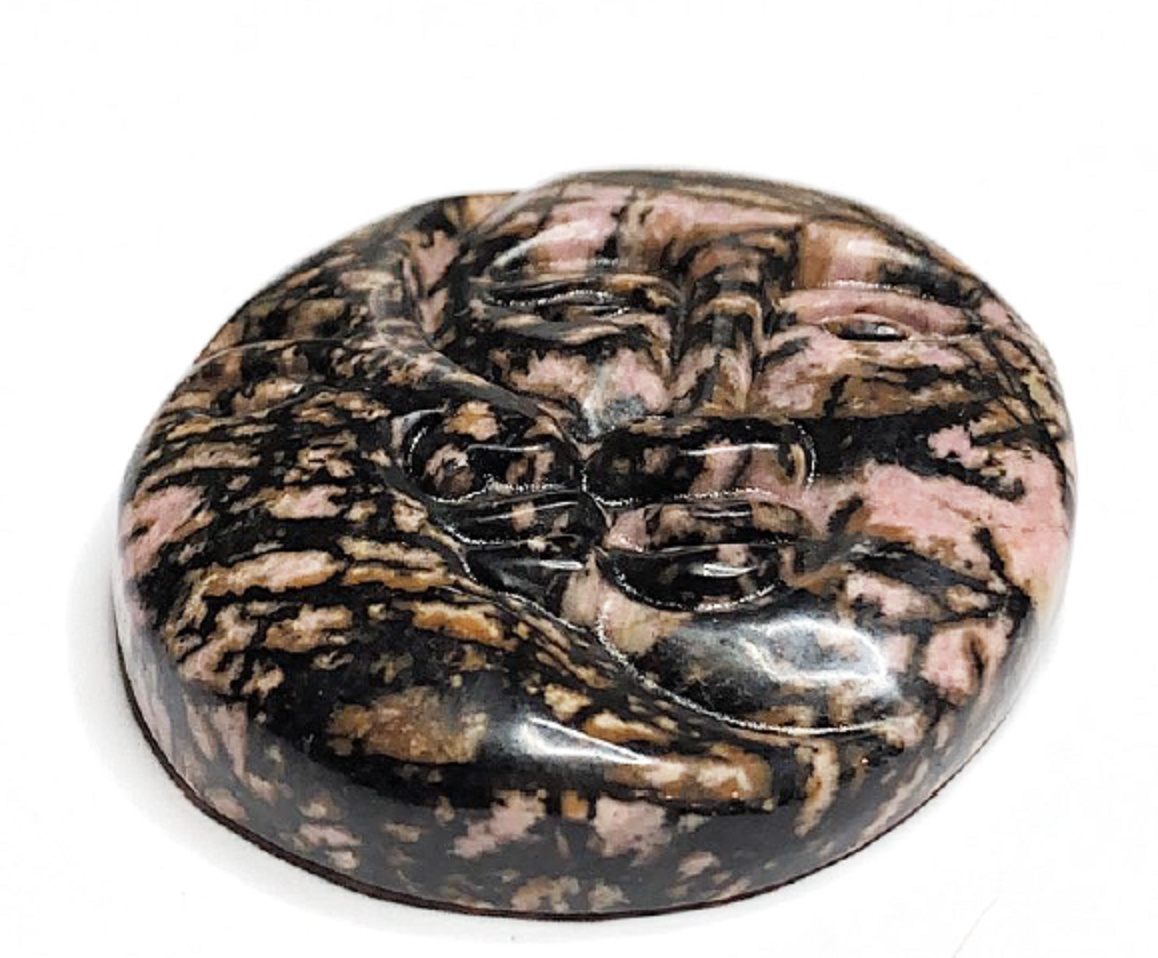 Rodonit tvář slunce a měsíc ručně vyřezávaný přírodní kámen 5 cm, kámen odpuštění