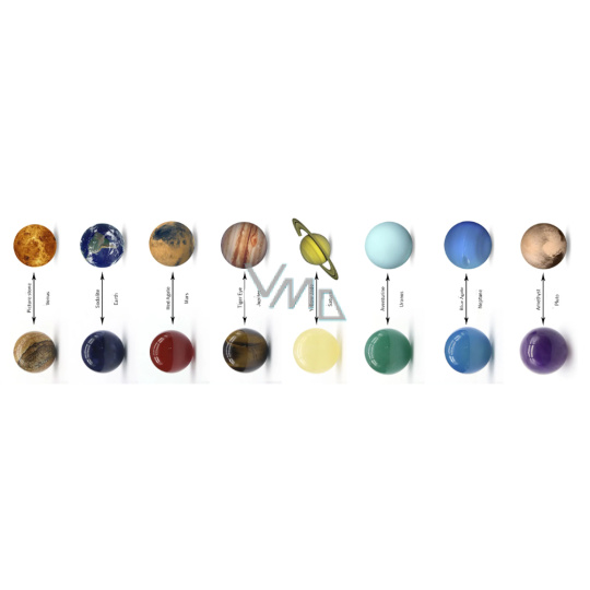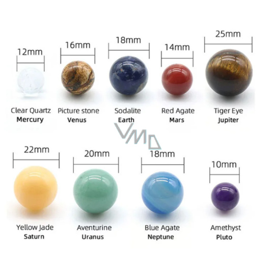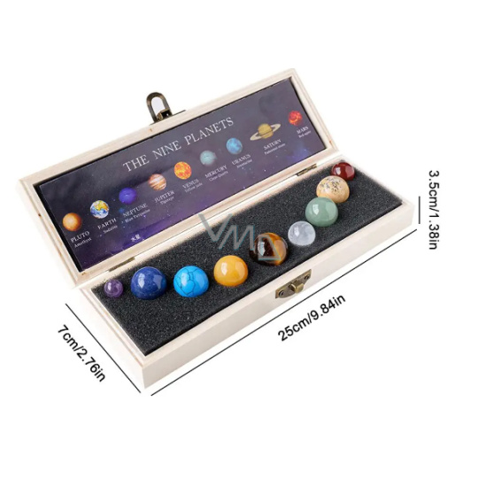 Sada devíti planet sluneční soustavy obsahuje 9 pravých drahokamů, u nichž je každý drahokam pečlivě vybírán a ručně vyroben. Těchto 9 skutečně jedinečných planet má svou vlastní energii léčení, která vám přináší zdraví a štěstí. Každá planeta je pečlivě ručně vyrobena, všechny planety jsou jedinečné. Devět planet sluneční soustavy: Merkur, Venuše, Země, Mars, Jupiter, Saturn, Uran, Neptun a Pluto.