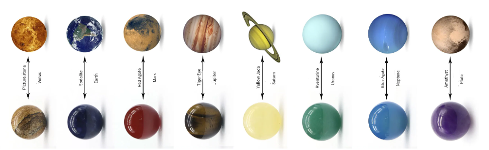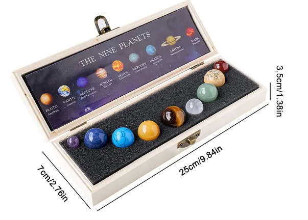 Sada devíti planet sluneční soustavy obsahuje 9 pravých drahokamů, u nichž je každý drahokam pečlivě vybírán a ručně vyroben. Těchto 9 skutečně jedinečných planet má svou vlastní energii léčení, která vám přináší zdraví a štěstí. Každá planeta je pečlivě ručně vyrobena, všechny planety jsou jedinečné. Devět planet sluneční soustavy: Merkur, Venuše, Země, Mars, Jupiter, Saturn, Uran, Neptun a Pluto.