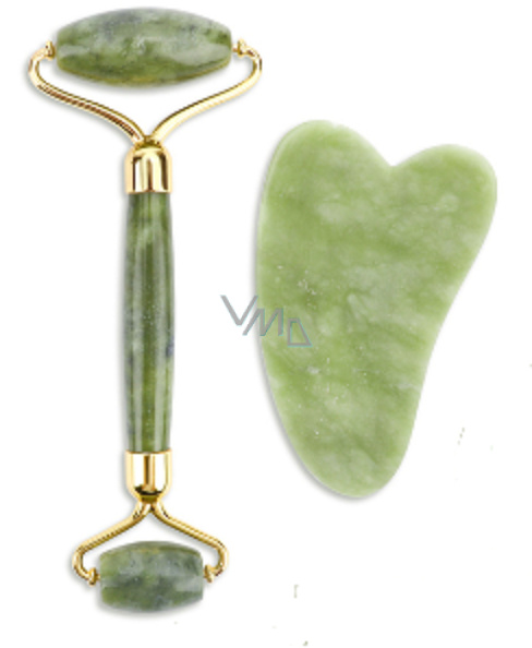 Serpentin Gua Sha 4,3 x 7,1 cm + váleček masážní 14 x 5,5 cm redukuje vrásky, otoky, zlepšuje pružnost pokožky, sada bez obalu
