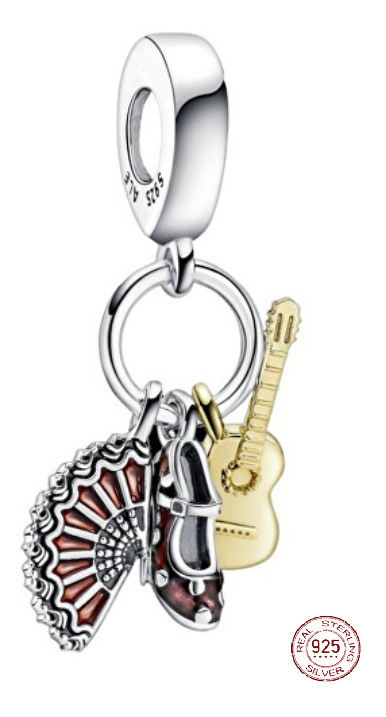 Tanec s duchem Španělska symbolizovaným v novém španělském Flamenco Guitar, Shoe & Fan Dangle Charm! Tento zdobený přívěsek je inspirovaný slavným hudebním dědictvím Španělska, obsahuje tři prvky visící na stříbrném prstenu; krásný krajkový vějíř zdobený smaltem plique-à-jour, robustní bota na flamenco ručně malovaná transparentním červeným smaltem a malá kytara pozlacená zlatem. Stříbrná kauce je také vyryta slovem „ SPAIN“, což z ní dělá okouzlující suvenýr.