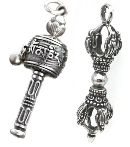 Buddhistické modlitební mlýnky (tibetsky Mani Khorlo) obvykle obsahují nejrozšířenější mantru Óm Mani Padme Húm. Bývá napsána nebo vytištěna na stočeném pruhu papíru, který je umístěný uvnitř válce. Roztočením mlýnku v pravotočivém směru se mantra aktivuje a harmonizuje okolní prostor i mysl praktikujícího. Mlýnky bývají zavěšené v řadách
