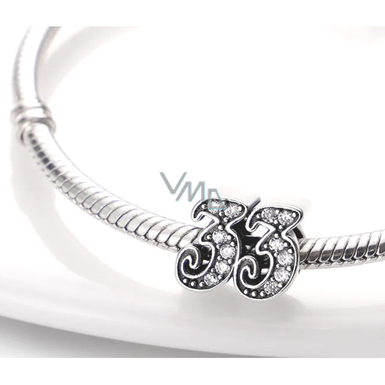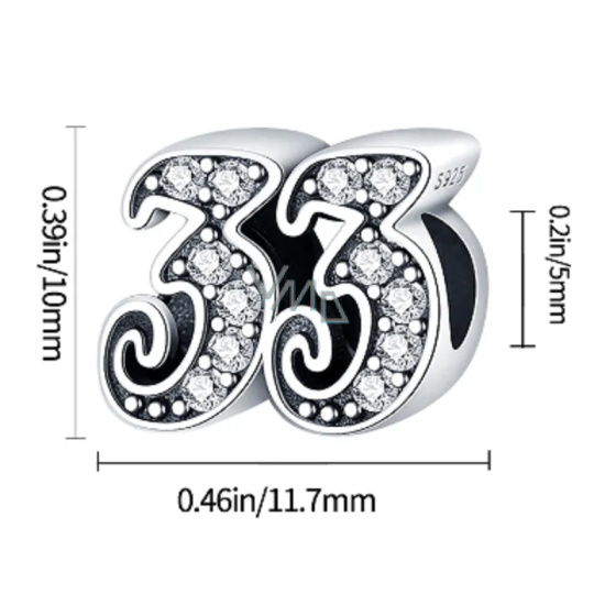 Tento přívěsek ze sterlingového stříbra pro náramky, vyrobený na oslavu 33. výročí nebo nezbedných 33 narozenin, je zvýrazněn kubickými Zirkony a korálkovými detaily.