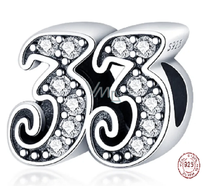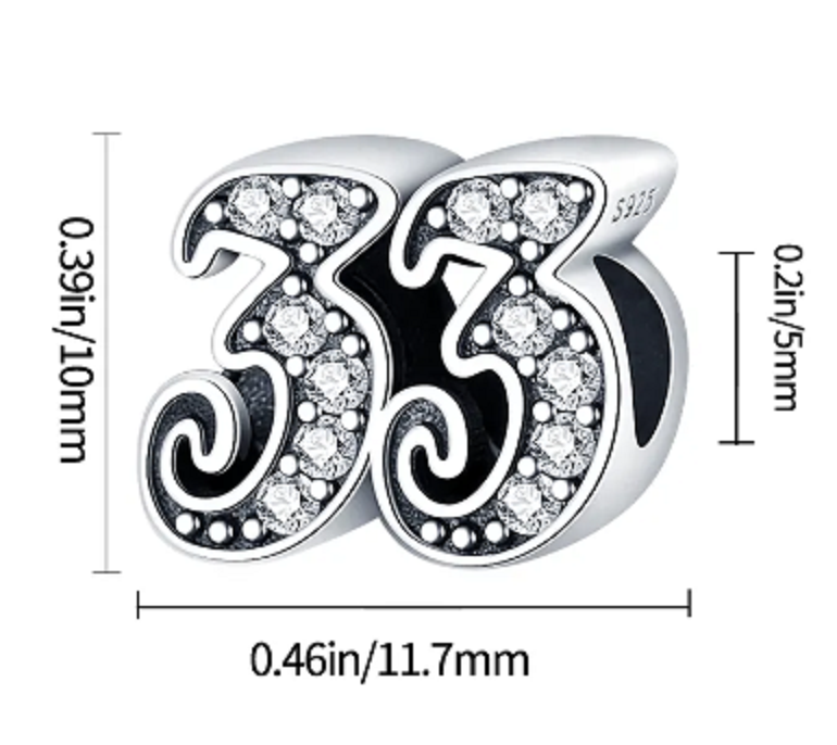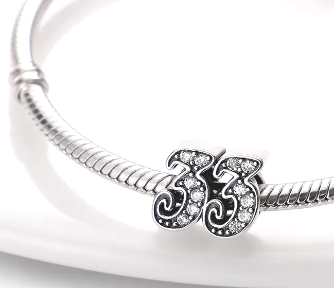 Tento přívěsek ze sterlingového stříbra pro náramky, vyrobený na oslavu 33. výročí nebo nezbedných 33 narozenin, je zvýrazněn kubickými Zirkony a korálkovými detaily.