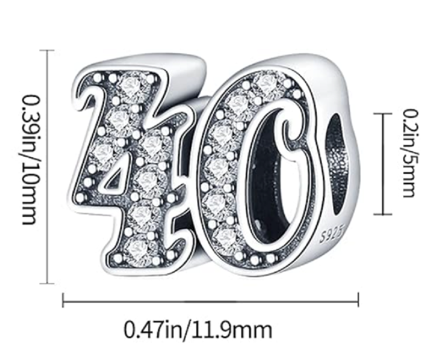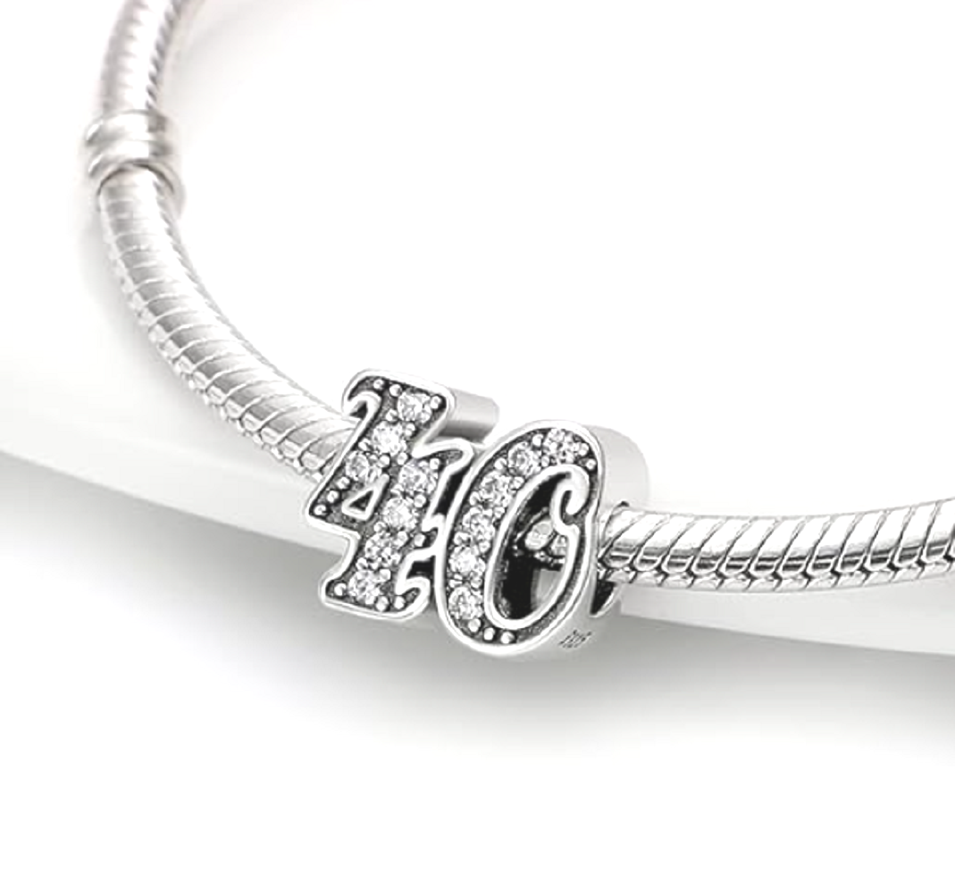 Tento přívěsek ze sterlingového stříbra pro náramky, vyrobený na oslavu 40. výročí nebo nezbedných čtyřiceti narozenin, je zvýrazněn kubickými Zirkony a korálkovými detaily.