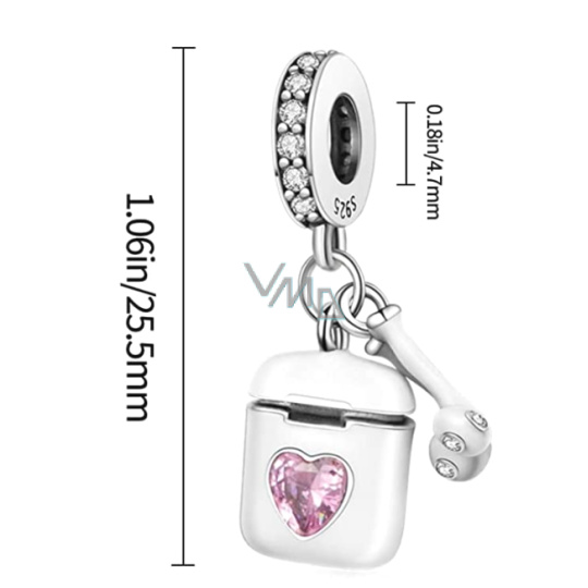 Visací přívěsek ze stříbra 925 se sluchátky se shodným pouzdrem navrženým s růžovým třpytivým Zirkonem ve tvaru srdce. Sluchátka a prsten přívěsku jsou zdobeny pochodujícími bílými drahokamy Zirkonu