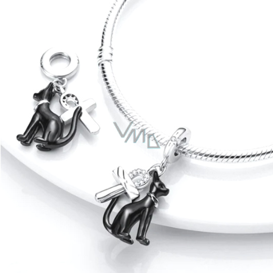Charm Sterlingové stříbro 925 Černá egyptská kočka a ankh kouzlo, přívěsek na náramek symbol