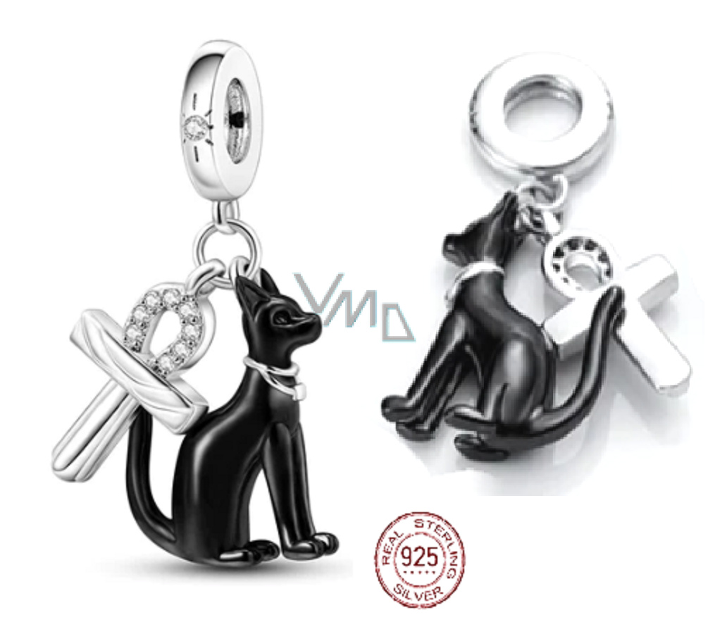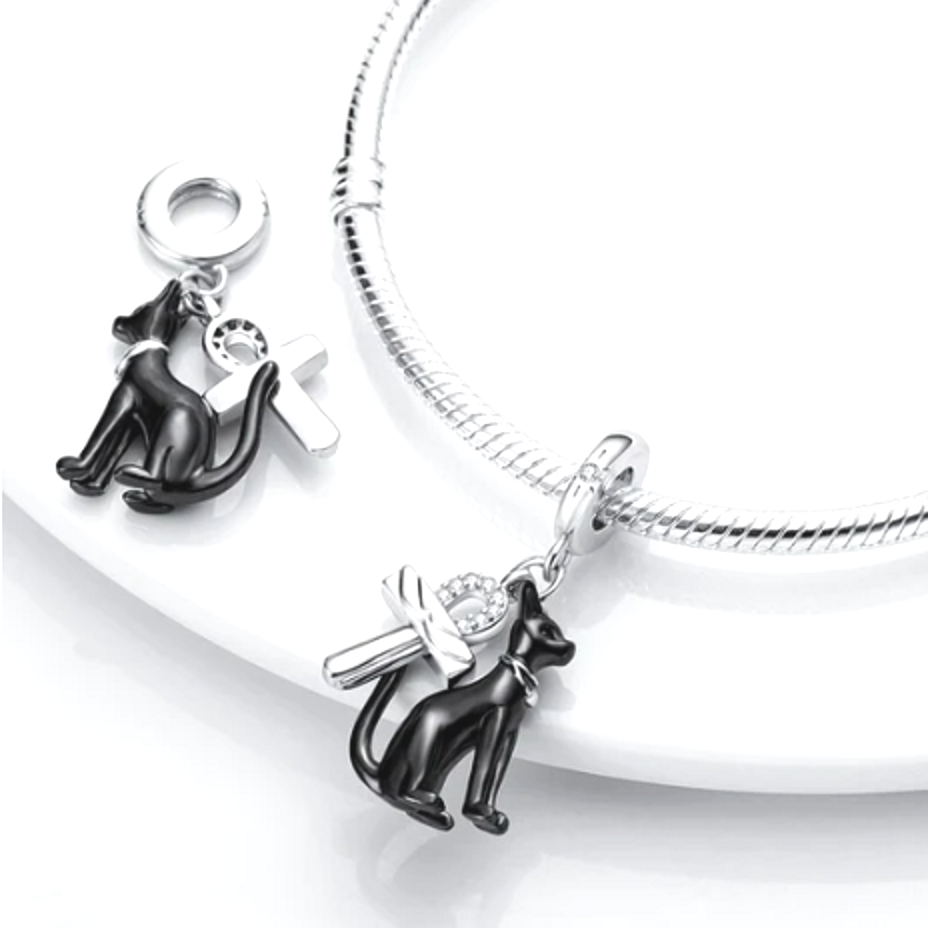 Charm Sterlingové stříbro 925 Černá egyptská kočka a ankh kouzlo, přívěsek na náramek symbol