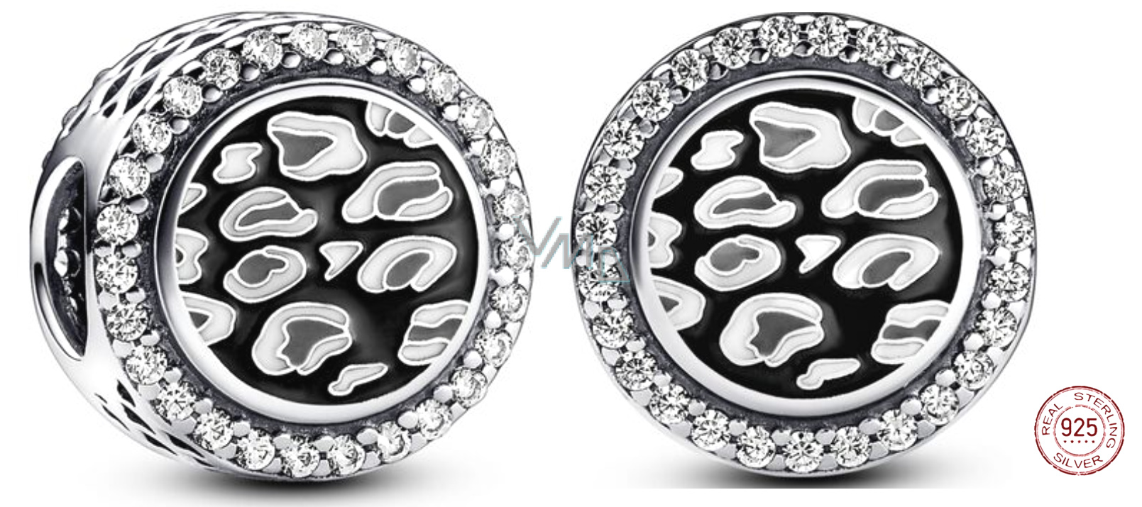 Stříbrný 925 kulatý přívěsek se zvířecím Leopardím potiskem na přední a zadní straně a pravými kubickými Zirkony po stranách s vyříznutým diamantovým motivem po stranách. Inspirací přívěsku se stal Leopardí potisk, který představuje krásné vzory z přírody, divokých zvířat, rostlin, šelmy žijící v džungli – leoparda.