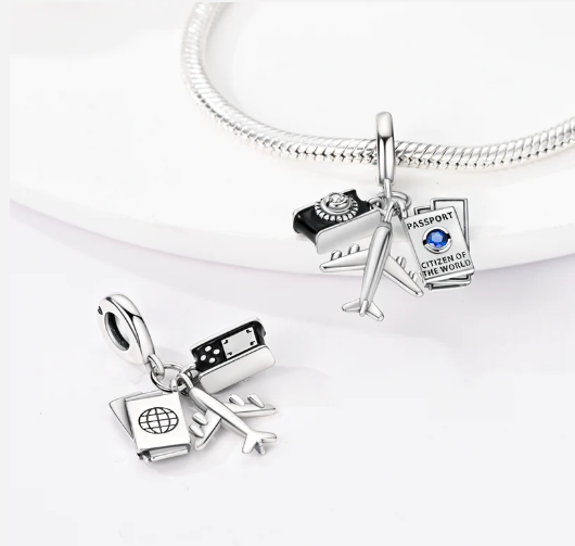 Charm Sterlingové stříbro 925 Cestovní pas, letadlo, fotoaparát 3v1, přívěsek na náramek cestování