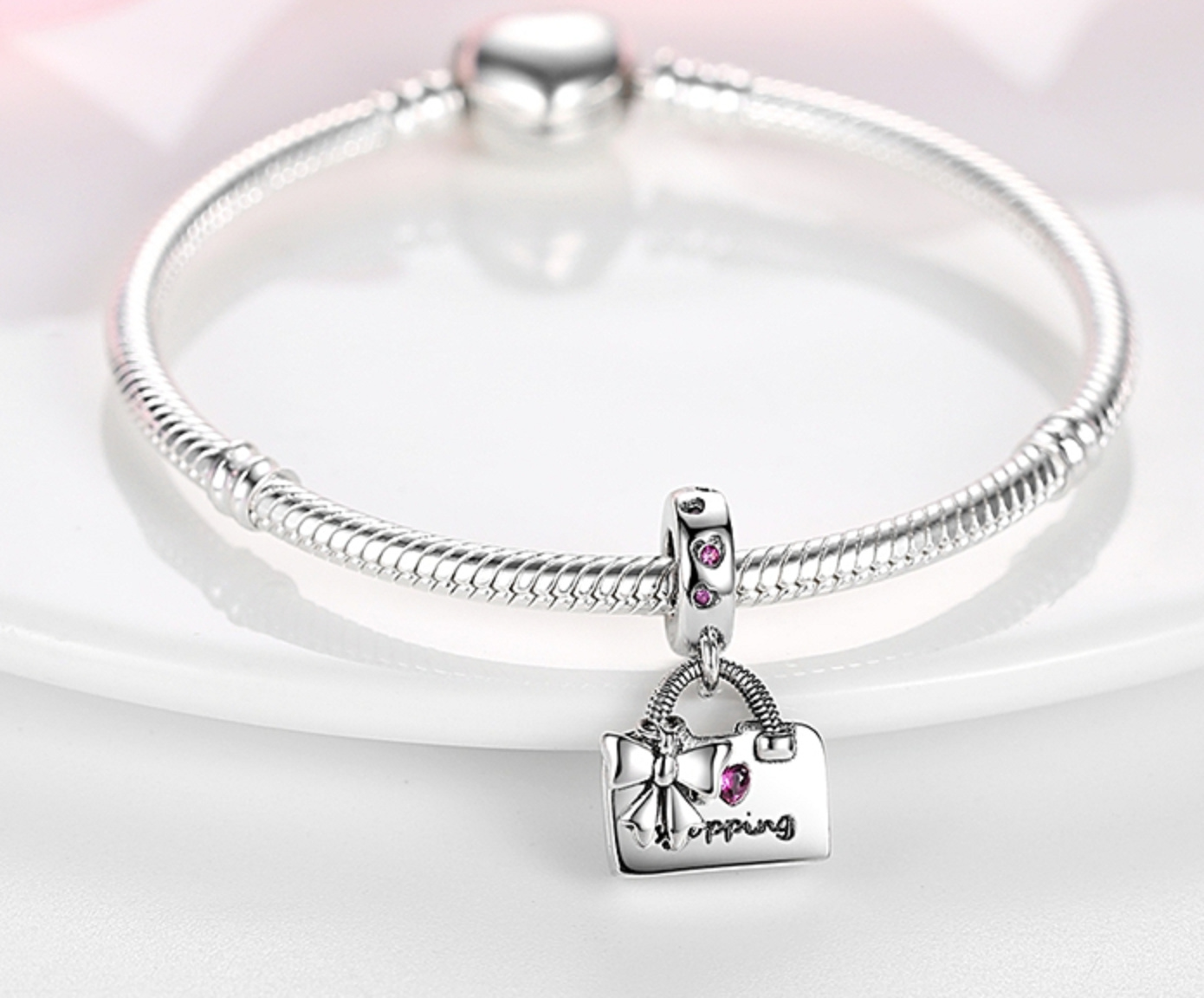 Charm Sterlingové stříbro 925 Chic style - Kabelka s mašlí - Miluji nákupy, přívěsek na náramek, zájmy