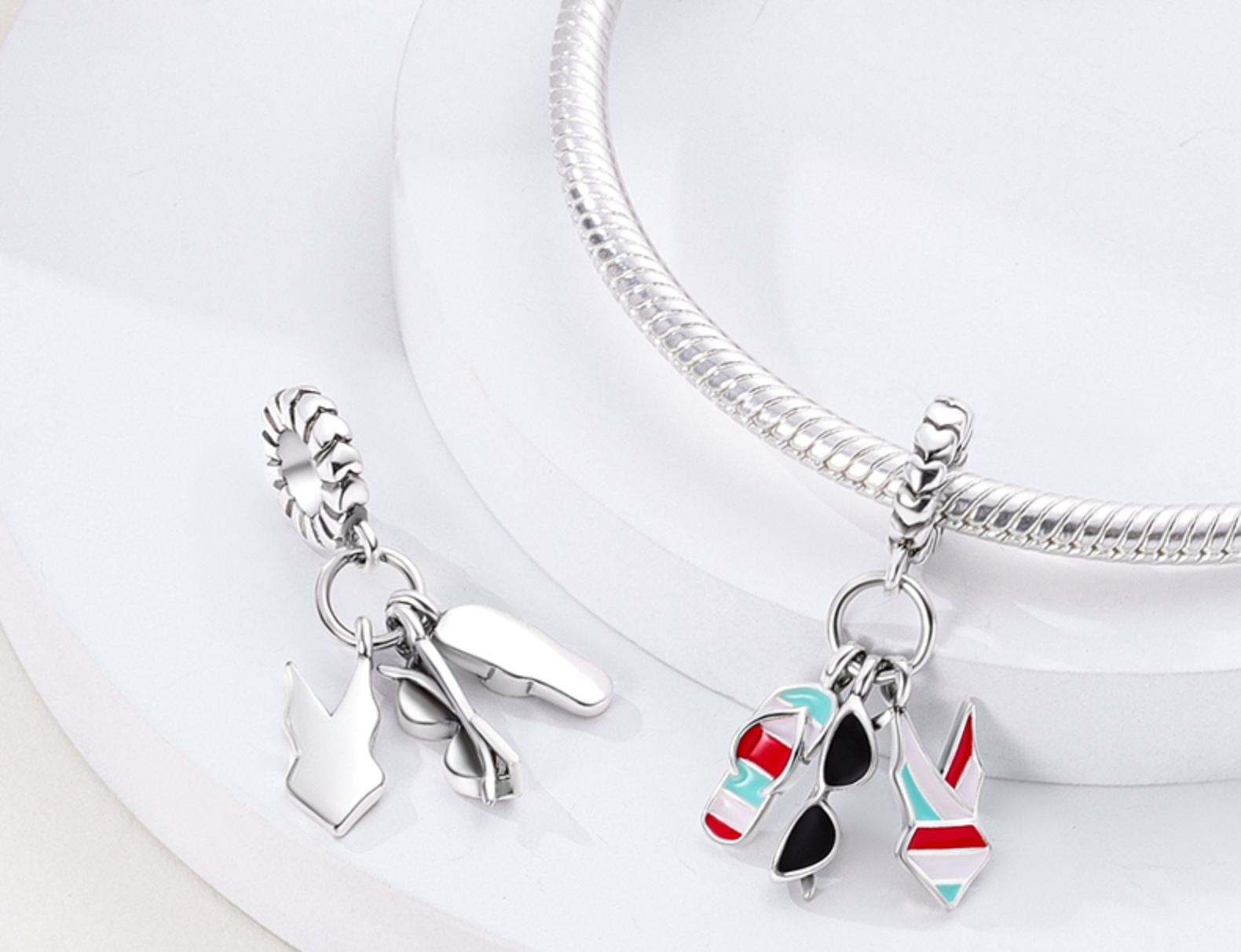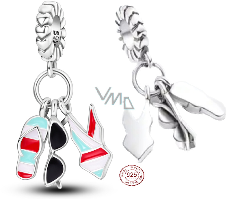 Charm Sterlingové stříbro 925 Chic style - Letní zábava, brýle, plavky, žabky, 3v1 přívěsek na náramek, zájmy