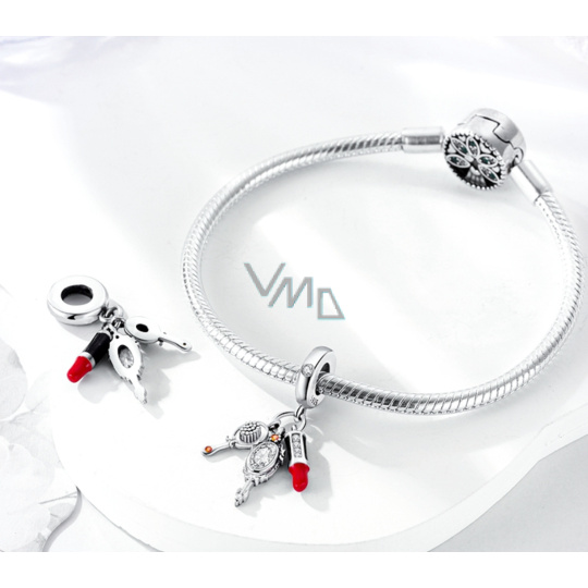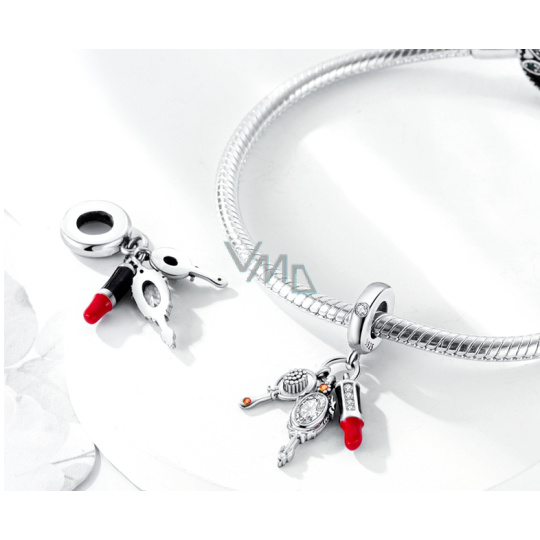 Visací přívěsek 925 Sterling Silver s červenou rtěnkou, zrcátkem a štětečkem s bílými a oranžovými třpytivými zirkonovými drahokamy a hladkým červeným a černým smaltem. S každým přívěskem vyprávějte svůj příběh a vytvořte náramek , který odráží, kdo jste a co je pro vás důležité. Tvůj styl. Váš náramek. Tvůj příběh.