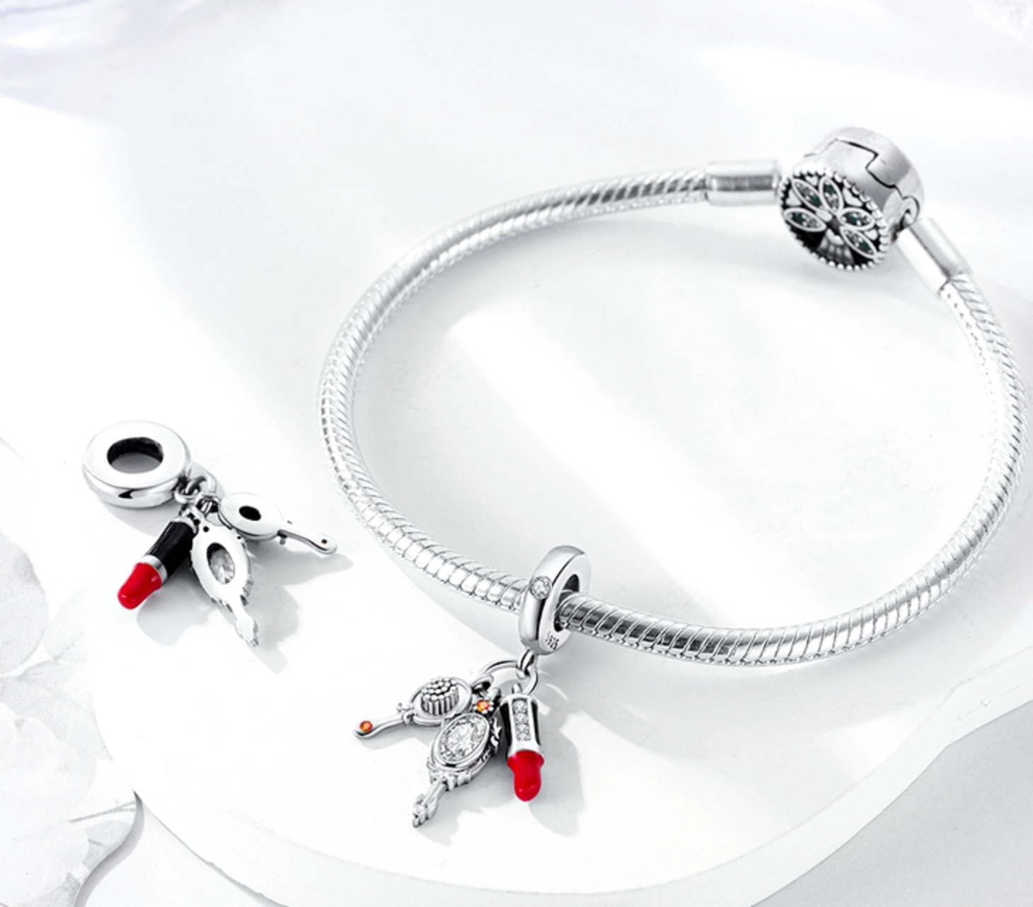 Visací přívěsek 925 Sterling Silver s červenou rtěnkou, zrcátkem a štětečkem s bílými a oranžovými třpytivými zirkonovými drahokamy a hladkým červeným a černým smaltem. S každým přívěskem vyprávějte svůj příběh a vytvořte náramek , který odráží, kdo jste a co je pro vás důležité. Tvůj styl. Váš náramek. Tvůj příběh.