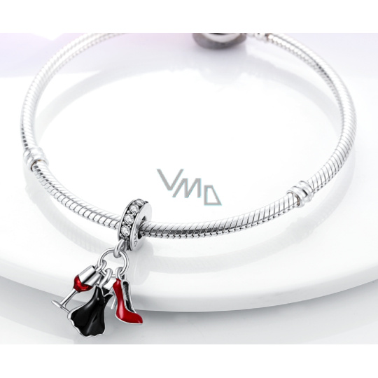 Symboly ženskosti - sklenici červeného vína, černé šaty a špendlík. Visací přívěsek 925 Sterling Silver s červenou botou na podpatku, roztomilými černými šaty a sklenkou červeného vína s hladkým černým a červeným smaltem a bílými třpytivými drahokamy Zirkonu. Čas na dívčí večer! S každým kouzlem vyprávějte svůj příběh a vytvořte náramek, který odráží, kdo jste a co je pro vás důležité. Tvůj styl. Váš náramek. Tvůj příběh.