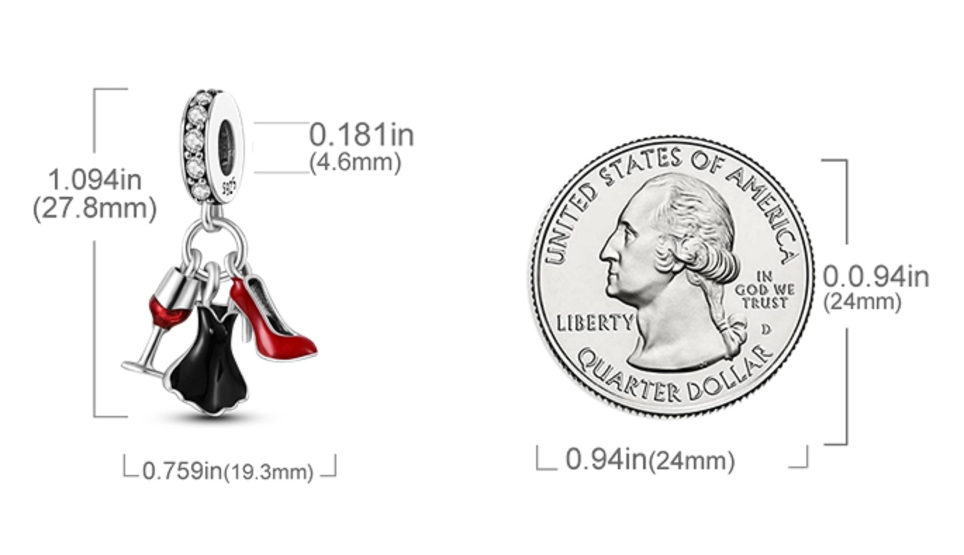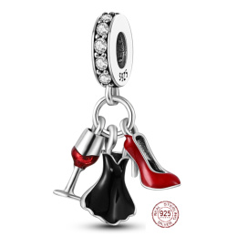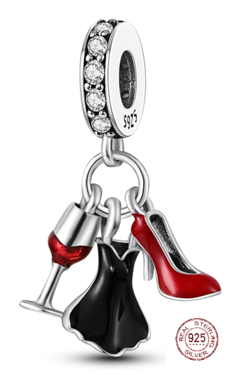Symboly ženskosti - sklenici červeného vína, černé šaty a špendlík. Visací přívěsek 925 Sterling Silver s červenou botou na podpatku, roztomilými černými šaty a sklenkou červeného vína s hladkým černým a červeným smaltem a bílými třpytivými drahokamy Zirkonu. Čas na dívčí večer! S každým kouzlem vyprávějte svůj příběh a vytvořte náramek, který odráží, kdo jste a co je pro vás důležité. Tvůj styl. Váš náramek. Tvůj příběh.