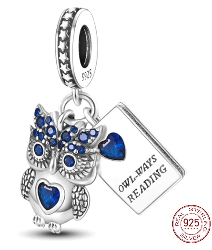 Dvojitý přívěsek s knihou s vyrytým nápisem „owl-ways reading“ a krásnou sovou navrženou s modrými třpytivými drahokamy Zirkonu. Sovička i kniha jsou opatřeny modrým Zirkonem ve tvaru srdce. Sovy symbolizují moudrost, intuici a inteligenci a knihy symbolizují znalosti a vzpomínky