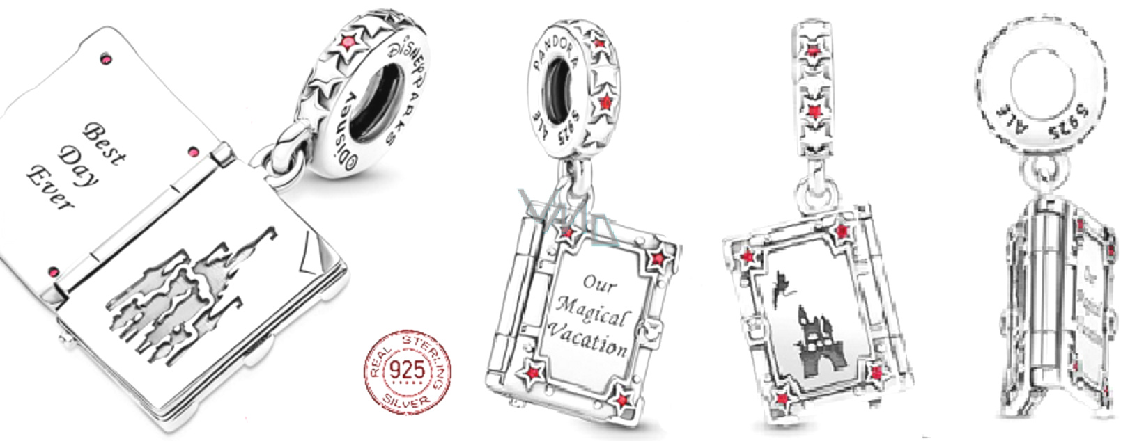Sbalte si kufry a připravte se na kouzelné dobrodružství! Zaznamenejte své vzpomínky ve sladkých Disney Parks Our Magical Vacation Book Dangle Charm. Roztomilá otevíratelná kniha visí na přívěsku zdobeném střídavě stříbrnými a jiskřivými červenými hvězdami. Čtyři červené kubické zirkonové Hvězdy také zdobí každý roh na přebalu knihy spolu s názvem „Naše kouzelná dovolená“. Otevřete stránky a odhalte vyrytá slova „Best Day Ever“ a vyražený obrázek ikonického zámku Disney. Roztomilý motiv Zvonilky a hradu je vyražen i na zadním přebalu.