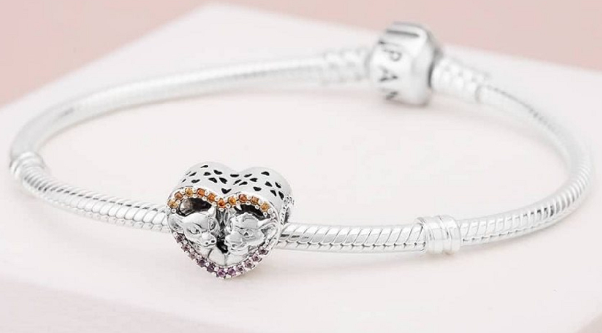 Předveďte svůj náramek hrdě s tímto přívěskem věnovanému Lvímu králi od Disney. Romantický šperk zobrazuje Simbu a Nalu ve chvíli lásky a přátelství a je orámován barevnými krystaly, kameny kubické zirkonie a Syntetickými safíry. Přidejte do své sbírky šperků kouzlo srdce, které symbolizuje zvláštní pouto nebo ukazuje, jak moc tyto postavy milujete.
