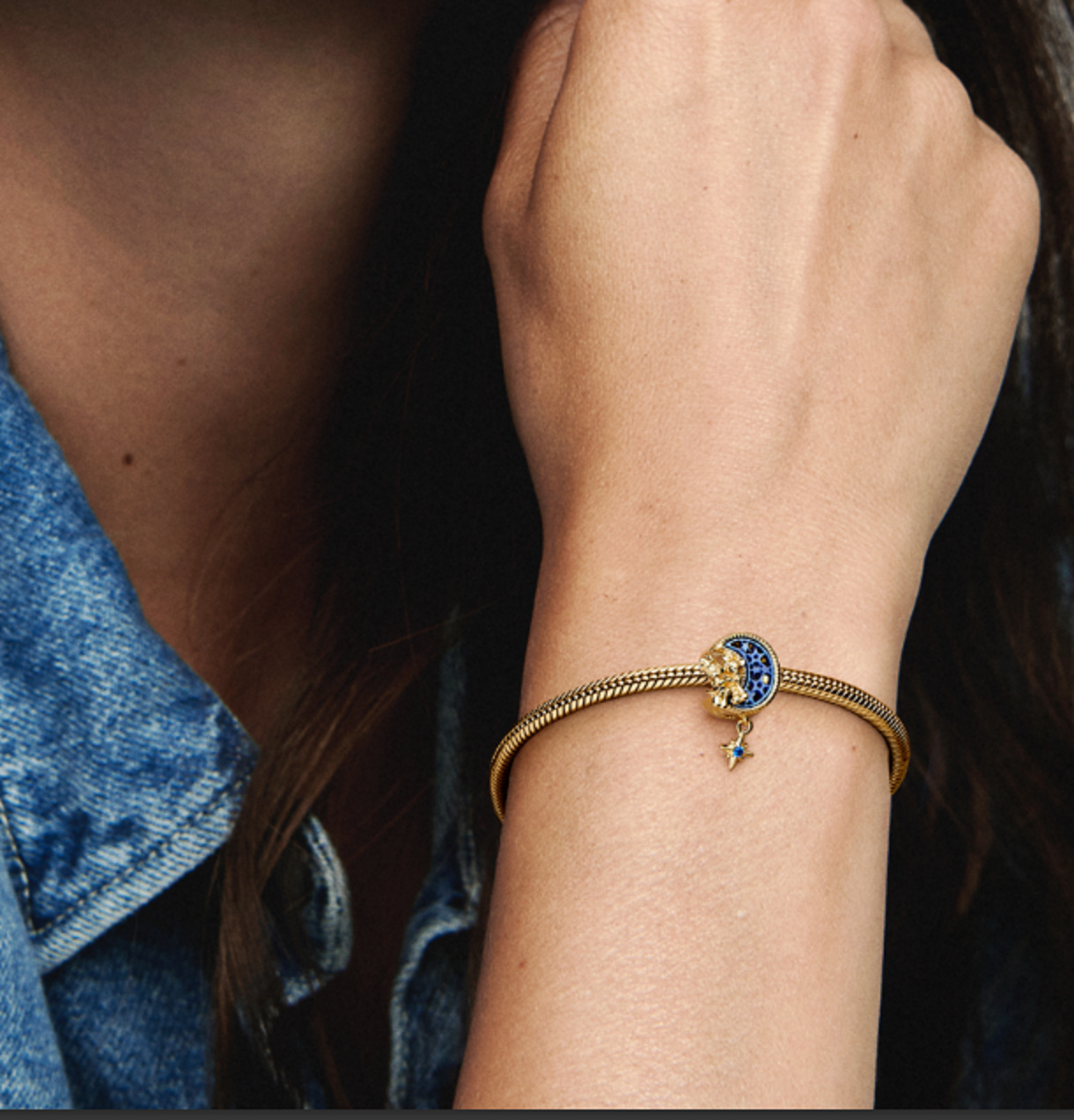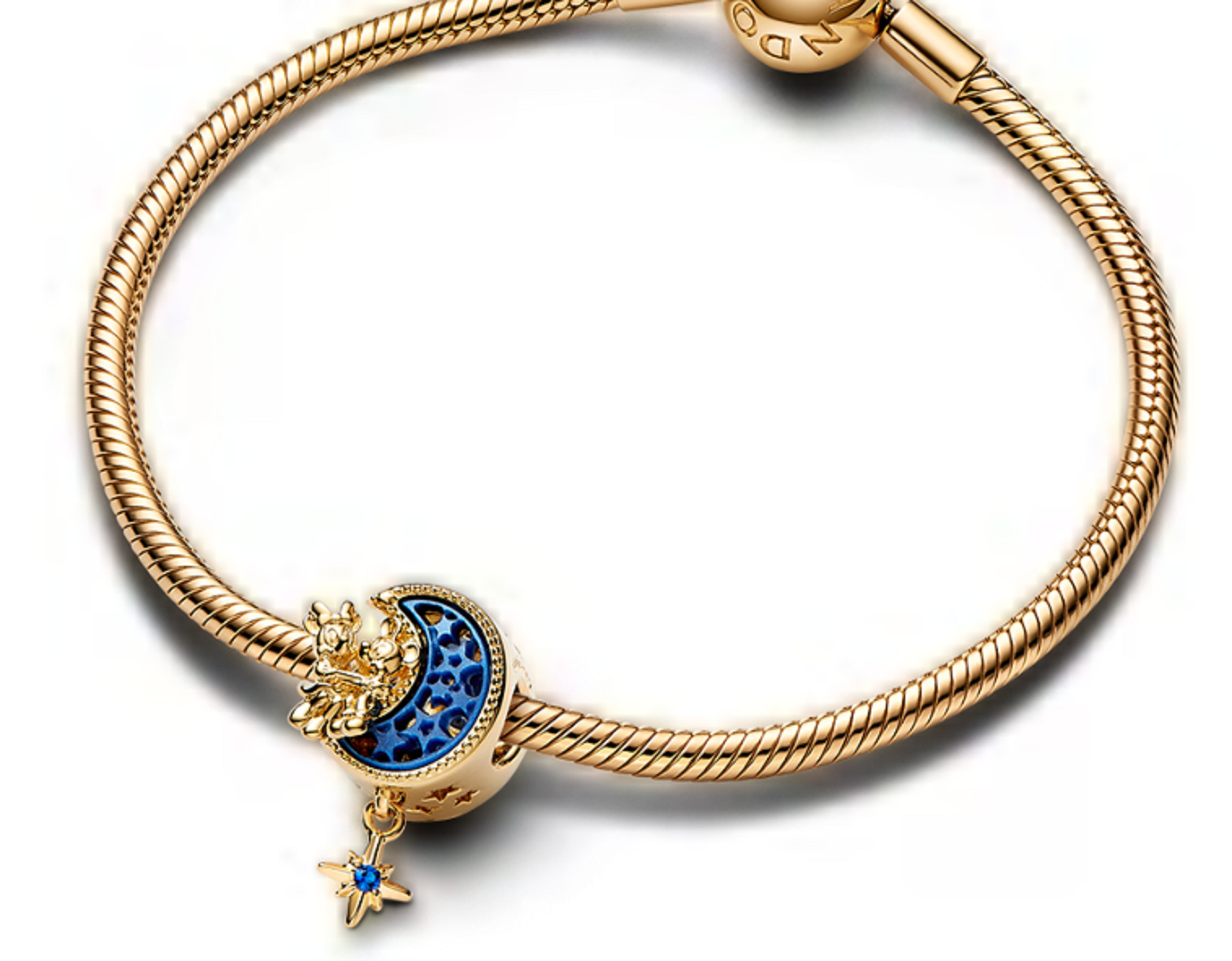 Noste své oblíbené hrdiny s přívěskem. Mickey Mouse a Minnie Mouse míří ke hvězdám na svém vlastním třpytivém srpku měsíce. Tento přívěsek je vyroben ze dvou tmavě modrých kousků umělé perleti z bioresinu ve tvaru měsíce s vyřezávaným hvězdičkovým vzorem. Přívěsek je jemně pozlacený 14karátovým zlatem a můžete ho kombinovat se svými oblíbenými přívěsky pro dodání barvy a třpytu.
