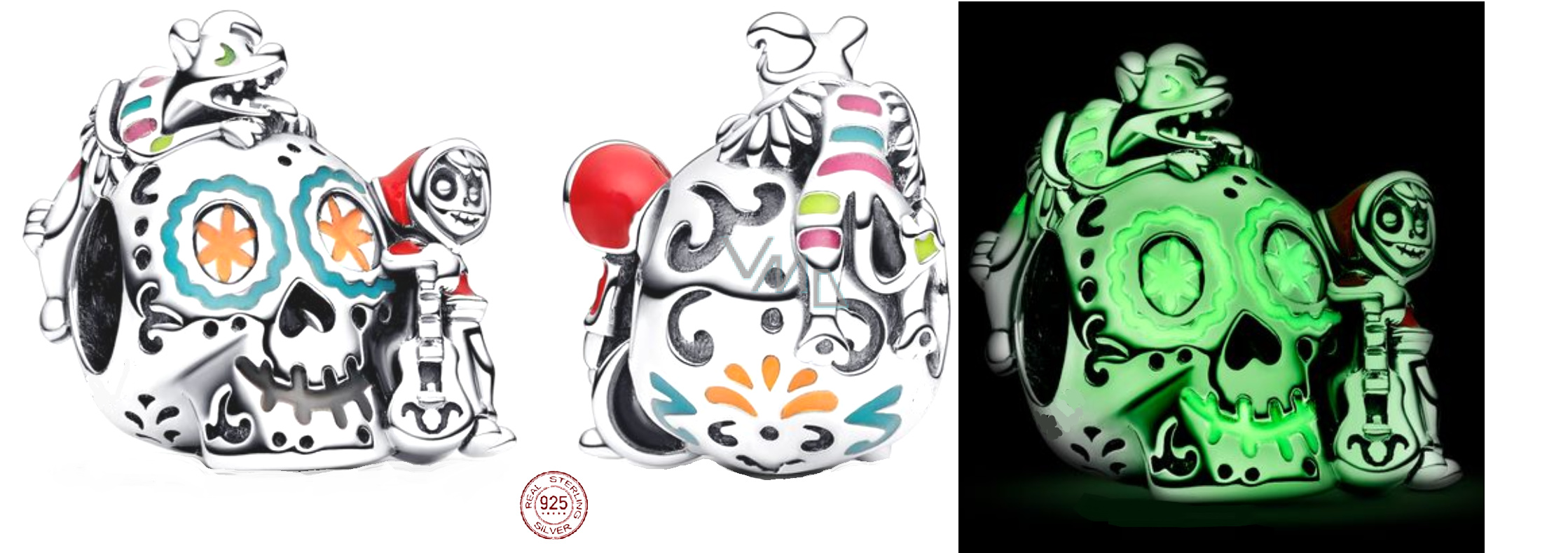 Charm Sterlingové stříbro 925 Disney Pixar Coco Miguel & Dante lebka zářící ve tmě, luminozní korálek na náramek, Halloween