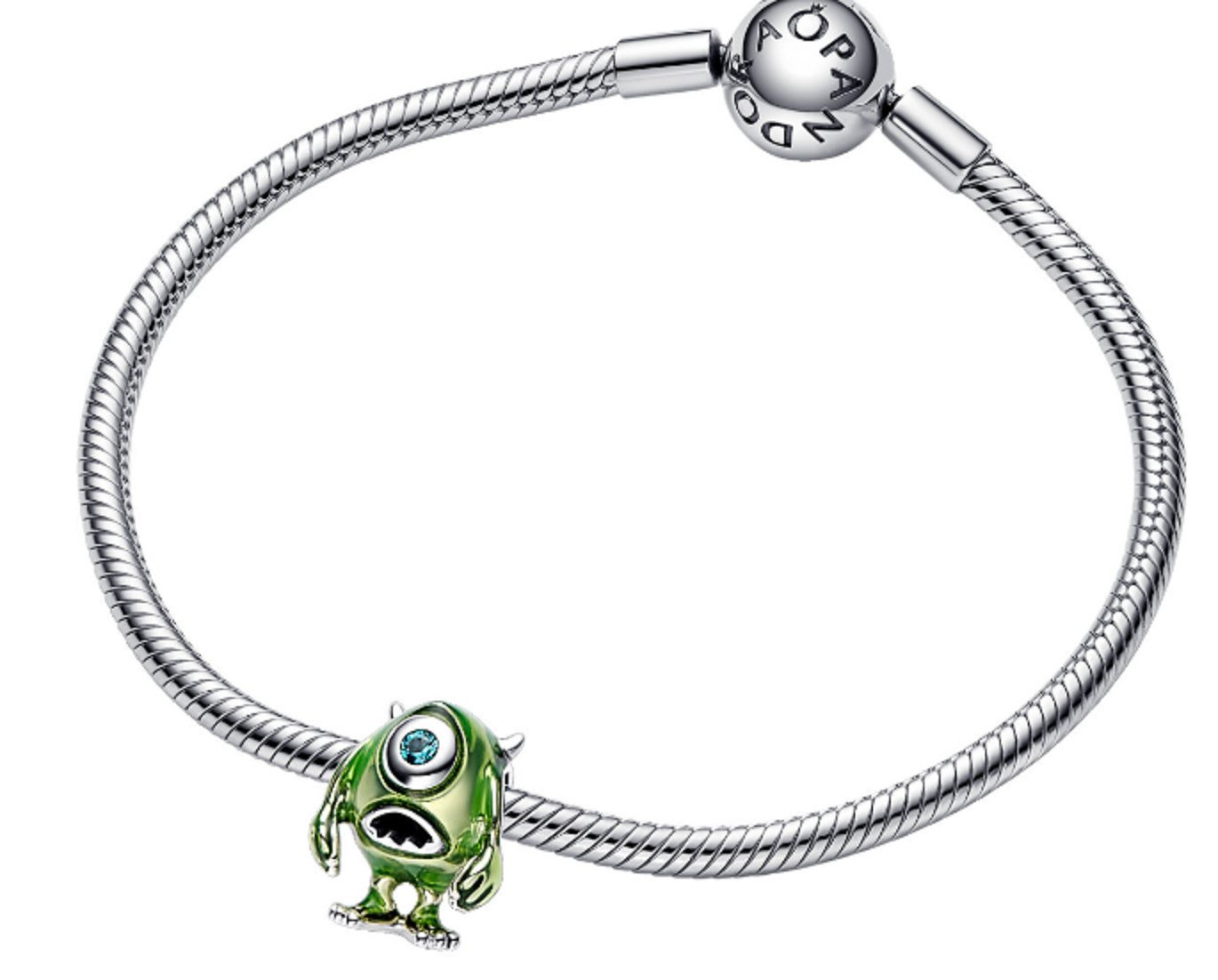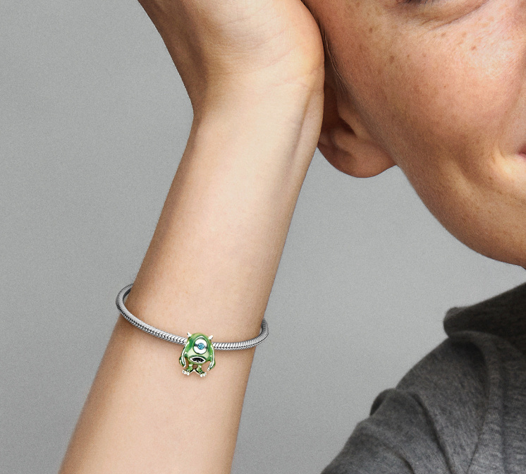 Zachyťte sílu smíchu a přátelství s kouzlem Disney Pixar Mike Wazowski. Tento stříbrný přívěsek s ručně aplikovaným zeleným smaltem zachycuje Mikův ikonický výraz obličeje a jediné oko, osazené zeleným umělým krystalem. Smalt je průhledný a dodává mu kovový lesk díky lesku mincovního stříbra pod ním. Upravte ho spolu s jeho kamarádem Sulleym a dalšími kouzly z kolekce Disney, abyste získali náramek, který vám připomene vaše oblíbené momenty s příšerami.