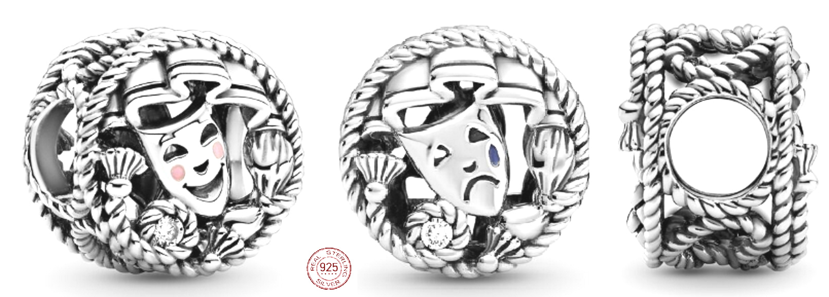 Charm Sterlingové stříbro 925 Divadelní masky, tragédie a komedie, korálek na náramek symbol