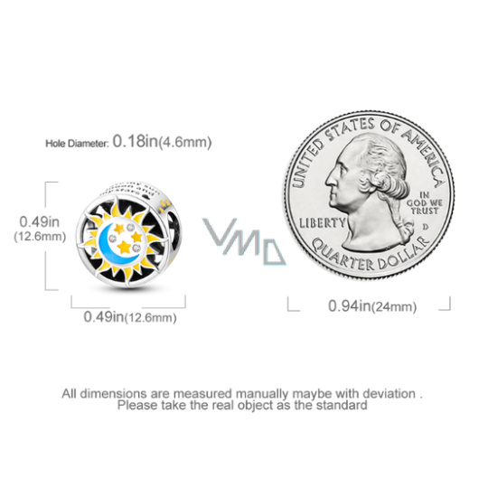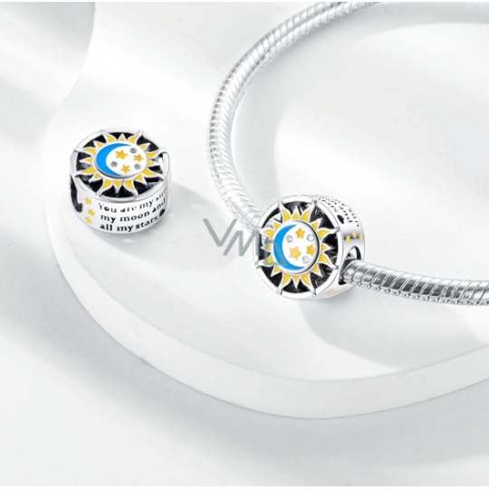 Přívěsek zářící v temnu s designem se sluncem, Měsícem a hvězdami navrženými s hladkým modrým a žlutým smaltem a bílými třpytivými drahokamy Zirkonu. Po stranách korálku jsou vyryta slova „jsi moje slunce, můj měsíc a všechny moje Hvězdy“.