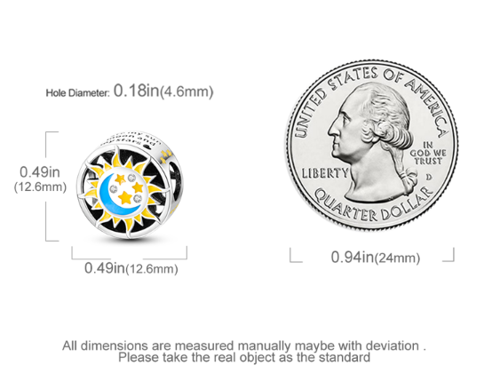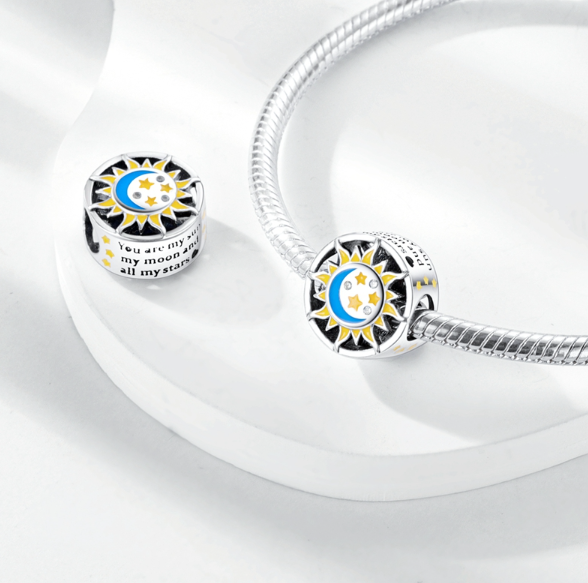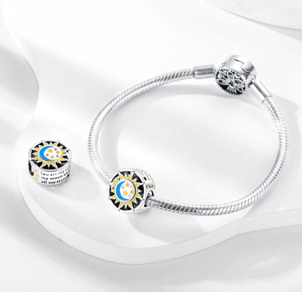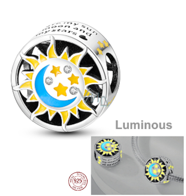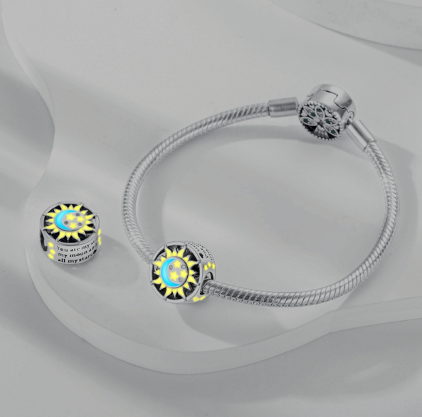 Přívěsek zářící v temnu s designem se sluncem, Měsícem a hvězdami navrženými s hladkým modrým a žlutým smaltem a bílými třpytivými drahokamy Zirkonu. Po stranách korálku jsou vyryta slova „jsi moje slunce, můj měsíc a všechny moje Hvězdy“.
